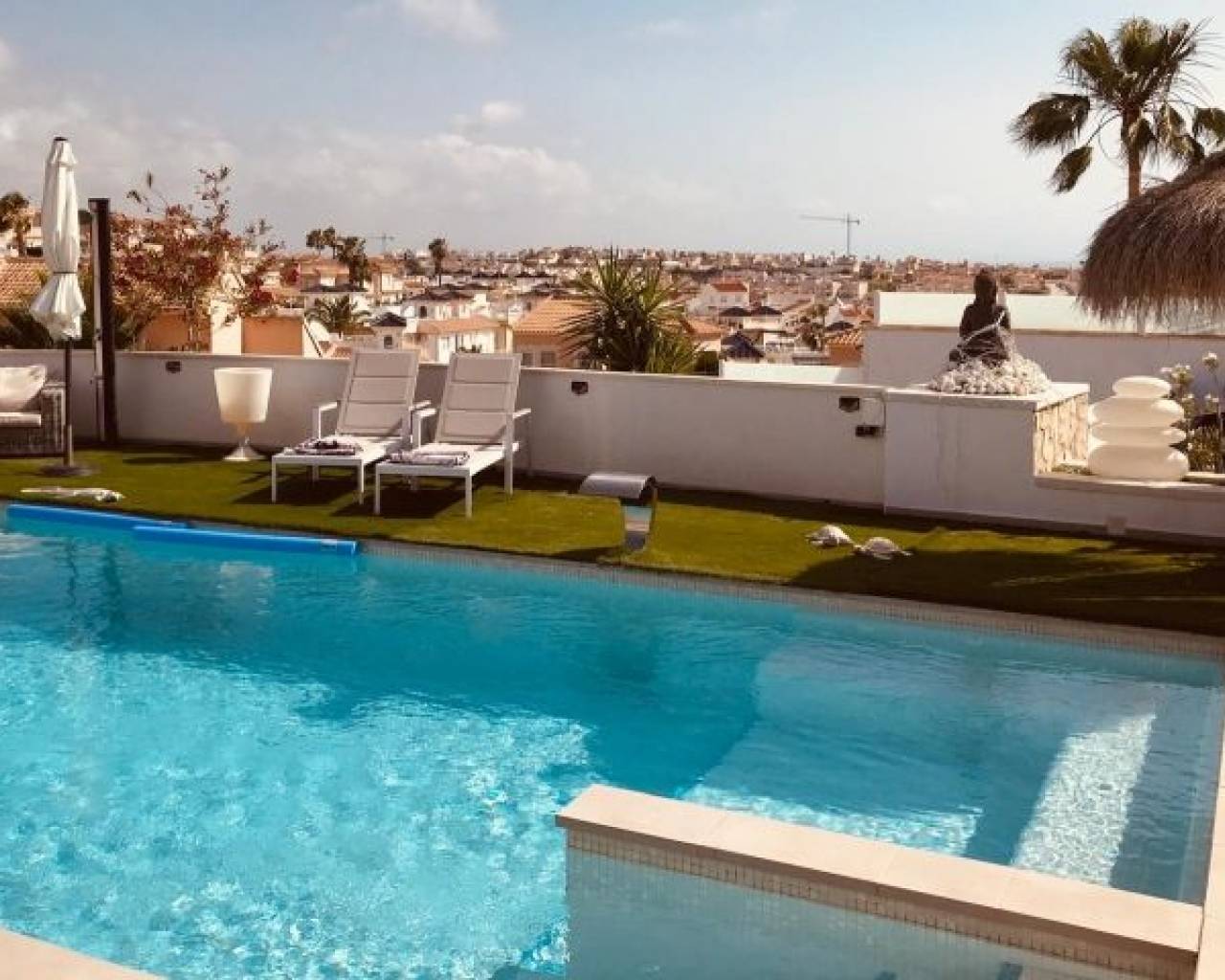 Neu gebaute, freistehende Villa mit einem Studio und zwei Apartments in Ciudad Quesada – Rojales zu verkaufen. Diese wunderschöne, neu gebaute Villa verfügt über zwei Apartments und ein Studio! Sie befindet sich in Ciudad Quesada, steht auf einem 1.000 m² großen Grundstück und besteht aus drei Gebäuden. Das Hauptgebäude besteht aus einem Haus mit einem 70 m² großen Wohn-/Esszimmer, einer offenen Küche mit Kochinsel, zwei großen Schlafzimmern, zwei Badezimmern en Suite und einer 120 m² großen Dachterrasse. Im hinteren Bereich befindet sich eine separate, 60 m² große Wohnung mit einem Wohnzimmer, einer offenen Küche, zwei Schlafzimmern und einem Badezimmer. In einem separaten Gebäude befindet sich ein Studio mit einem Schlafzimmer und einem Badezimmer. In einem weiteren separaten Gebäude befindet sich ein multifunktionaler Raum mit einem Schlafzimmer und einem Badezimmer, der derzeit als Büro genutzt wird, aber in einen Wohn- oder Lagerraum umgewandelt werden kann. Es gibt einen großen, teilweise gefliesten Garten mit automatischem Tor, einen privaten Pool und ausreichend Parkplätze. Vom Dach bietet das Haus einen Blick auf das Tal und das Meer in der Ferne. Das Haus ist mit einer Kameraüberwachung ausgestattet. Ideal für ein B&B. Kürzlich (Mai 2024) wurden Anbauten und Erweiterungen hinzugefügt, wie z. B. Kunstrasen, eine Pergola, eine Außenbar im Erdgeschoss usw.