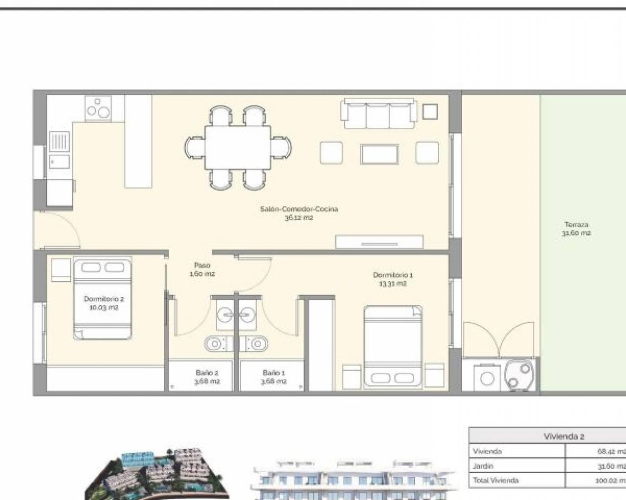 NEU GEBAUTE WOHNANLAGE IN FINESTRAT Neubau-Wohnanlage in Balcon de Finestrat. Dieser Komplex von modernen Wohnungen mit 2 Schlafzimmern, 2 Bädern, offene Küche mit dem Wohnbereich. Einige der Wohnungen haben Meerblick. Die Wohnungen im Erdgeschoss verfügen über einen privaten Garten, die Wohnungen im mittleren Stockwerk über Terrassen und die Wohnungen im obersten Stockwerk über Terrassen und private Solarien. Jede Wohnung hat einen privaten Tiefgaragenplatz. Die Eigenschaften haben Zugang zu den gemeinsamen Bereich mit 3 Swimmingpools, Parkplatz, Paddel, Spielplatz, Gymnastik. Es ist eine große Chance und das Privileg, in der Lage sein, mit dieser Umgebung von Golf und Strand zu leben, in der Nähe zu allen Annehmlichkeiten aller Dienste als einer der besten Orte zu investieren. Finestrat befindet sich in der Marina Baixa Region der Costa Blanca. Benidorm ist nur eine fünfminütige Fahrt von den Eigenschaften und bietet alle Dienstleistungen, die Sie benötigen, einschließlich Geschäfte, Bars, Restaurants, Supermärkte, Banken, Apotheken und mehrere private internationale Schulen. In der Nähe befinden sich die Strände von Levante, Poniente und Cala de Finestrat, die mit einer Länge von mehr als 6 km zu den besten in Europa gehören und von der Europäischen Union mit der Blauen Flagge ausgezeichnet wurden. Alle Freizeitangebote wie die Themenparks Aqua Natura, Terra Mítica, Terra Natura, Aqualandia und Mundomar, die Golfplätze Sierra Cortina und Villaitana, Wandern und Klettern auf dem Puig Campana in einer unvergleichlichen natürlichen Umgebung oder Wassersport. Entfernung zum Meer 4 km, zum Flughafen 26 km und zum Golfplatz 1km.