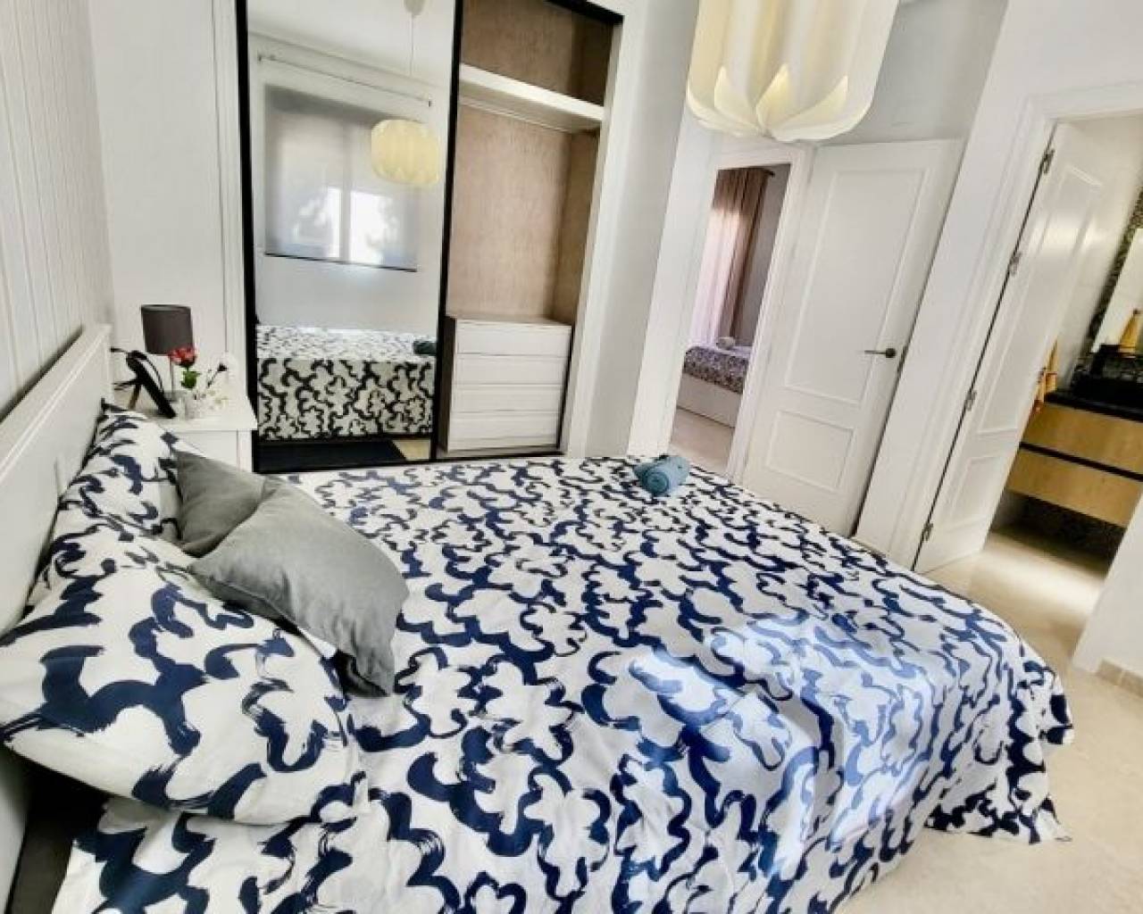 Elegantes, komplett renoviertes Stadthaus mit drei geräumigen Schlafzimmern und drei modernen Bädern. Die Immobilie verfügt über eine großzügige, moderne Küche mit brandneuen Geräten sowie brandneue, hochwertige Möbel – alles im Verkaufspreis inbegriffen. Der helle, offene Wohn- und Essbereich schafft eine einladende Atmosphäre, während jedes Schlafzimmer mit Einbauschränken für optimalen Stauraum ausgestattet ist. Die Villa befindet sich auf einem ca. 100 m² großen Grundstück mit privatem Garten. Die Bewohner haben Zugang zu einem Gemeinschaftspool und angelegten Grünflächen. Zusätzlich besteht die Möglichkeit, einen Tiefgaragenstellplatz und einen ca. 12 m² großen Abstellraum zu erwerben.