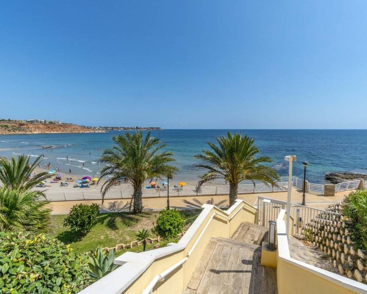 Fantástico Apartamento con vistas panorámicas al mar en primera línea. Planta segunda , orientación sur. El apartamento de 91m2, cuenta con tres dormitorios, dos baños completos (uno en suite), cocina independiente, equipada, salón-comedor y la terraza de unos 15m2. A/A en el salón. Se vende parcialmente amueblado. El residencial con piscina se encuentra justo encima de la playa de Aguamarina y de Campoamor, con accesos privados directos a la playa. El apartamento dispone de plaza de parking y trastero.