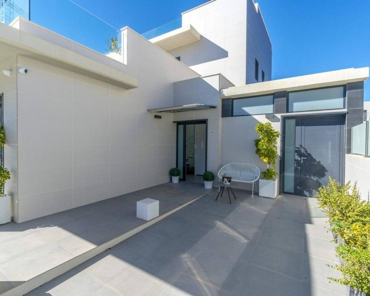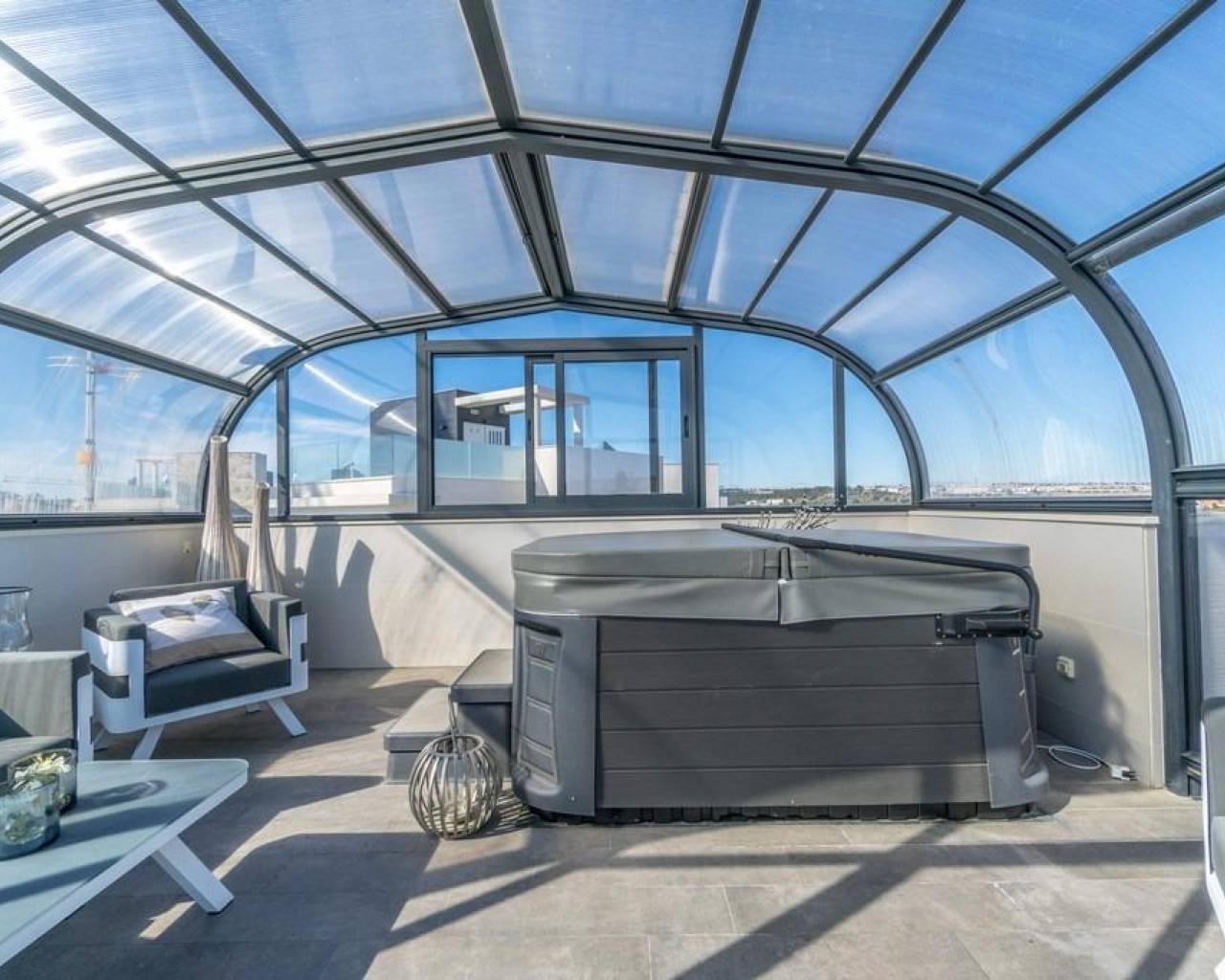 Magnifica Villa de lujo ubicada en Dehesa de Campoamor solamente a 300 m de la playa. Construida sobre la parcela de 500 m2, tiene el superficie construida de 200 m2. Distribuida en dos plantas: en la planta baja con la superficie de 160m2 encontramos el gran salón -comedor, cocina americana, 2 dormitorios, 2 baños, porche. En la primera planta está una habitacion más, baño, solárium medio-cubierto con jacuzzi y zona relax. Vistas al mar y alrededores desde solárium. Equipada con suelo radiante, aire acondicionado centralizado instalado, parking en la parcela. Piscina privada climatizada de agua salada. Orientación sureste. Se vende amueblada y equipada. Tiene una ubicación perfecta: a 50 m de supermercado, farmacia, a 200m gran variedad de bares y restaurantes, paseo marítimo y las playas de Campoamor a 300m .