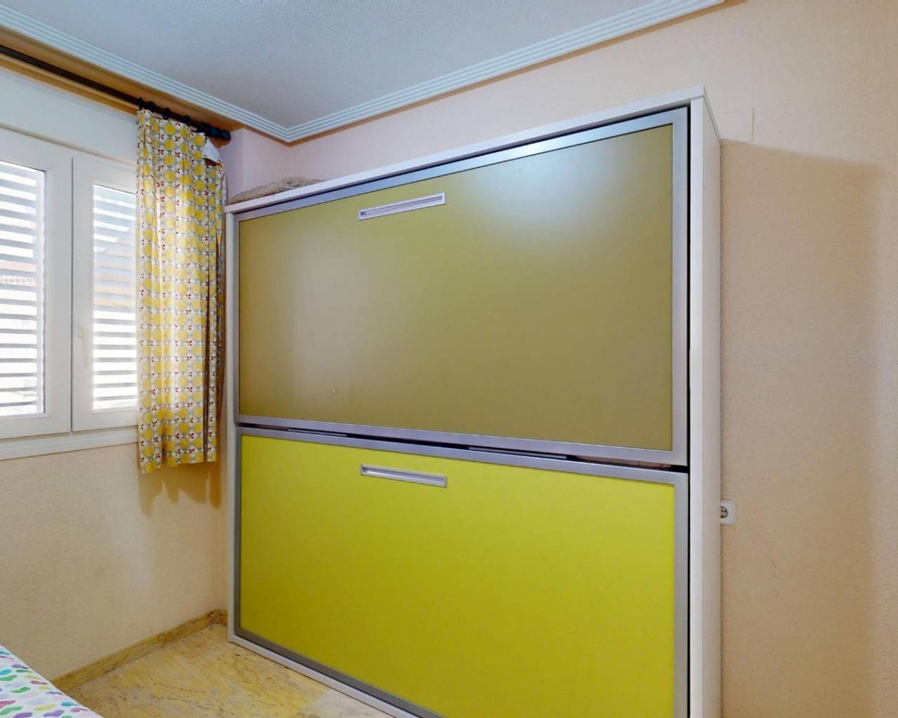 Este magnífico bungalow ubicado en el Residencial Calas de Campoamor, situado a poca distancia de la playa. La vivienda, toda exterior y orientada principalmente a sur, tiene entrada por dos calles, disfrutando así de una ventilación cruzada que garantiza el estar fresco y cómodo durante todo el día. Si entramos por la avenida principal, tenemos acceso a un porche con entrada a zona lavandería, con un baño completo. Esta parte da acceso a una amplia cocina con gran capacidad de almacenaje. Está comunicada con el salón comedor que da directamente a la terraza orientada a Sur, y a una zona exclusiva y privada de la urbanización para disfrutar de una total intimidad y por donde también tiene acceso a la vivienda. Tiene dos amplios dormitorios, el principal dando también a sur con un gran ventanal y el segundo dormitorio tiene amplitud para una cama de 90 y una litera que se queda totalmente recogida dejando todo el espacio de la estancia libre para uso. Los dos dormitorios tienen armarios empotrados de gran capacidad. Además, hay un segundo baño con un pie de ducha. La vivienda dispone de buenas calidades, suelo de mármol, ventanas con climalit y persianas mallorquinas de aluminio, todo de seguridad, puertas lacadas en blanco, aire acondicionado, toldo en la terraza, ventiladores... Para completar, esta fantástica vivienda cuenta con una amplia plaza de garaje y un trastero en la misma finca. Es una de las mejores urbanizaciones de Campoamor, con una gran piscina comunitaria perfectamente cuidada, con acceso desde la misma urbanización a playa Aguamarina.