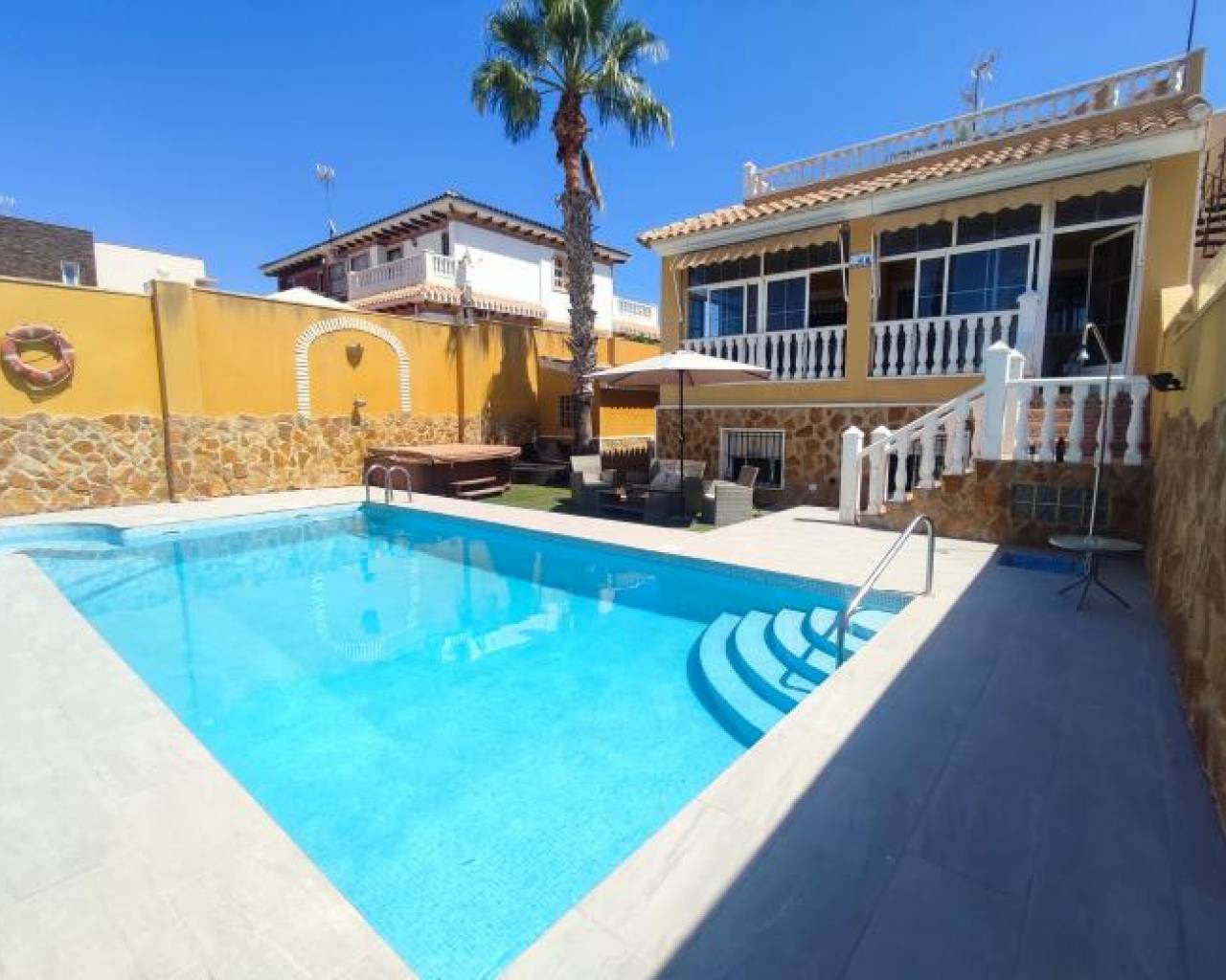Descripción de la Propiedad Descubra este magnífico chalet ubicado en la codiciada zona de Aguas Nuevas, en Torrevieja, una joya de la Costa Blanca en la provincia de Alicante. Este espacioso hogar destaca por su diseño contemporáneo y su amplia distribución, ofreciendo un espacio perfecto para disfrutar del cálido clima mediterráneo. Distribución y Confort Con un total de 350 m² construidos, esta villa se ofrece como un refugio ideal para familias numerosas o aquellos que buscan un hogar con amplios espacios. Con 6 acogedoras habitaciones y 4 baños bien equipados, cada miembro de la familia encontrará su propio espacio privado para relajarse y recargar energías. Exteriores y Espacios Adicionales El chalet se asienta sobre una generosa parcela de 400 m² que incluye un hermoso jardín rodeado de naturaleza, perfecto para disfrutar del aire libre y del sol. La piscina privada es el punto focal del exterior, invitando a refrescantes baños durante los cálidos días de verano. Además, la propiedad cuenta con parking privado y un trastero, brindando la comodidad y el espacio de almacenamiento necesarios. Comodidades y Acabados El interior de la villa ha sido diseñado con atención al detalle. La cocina independiente proporciona un ambiente funcional y acogedor, ideal para aquellos que disfrutan de la gastronomía. El aire acondicionado y la calefacción por conductos garantizan el máximo confort durante todo el año. Ventanas de doble acristalamiento y una puerta de seguridad añaden un nivel extra de tranquilidad y protección. Ubicación y Accesibilidad Situado en Aguas Nuevas, este chalet se beneficia de una ubicación estratégica con excelentes comunicaciones. Las playas de Torrevieja, reconocidas por su belleza y calidad, están a pocos minutos en coche. Este enclave ofrece no solo un ambiente residencial tranquilo, sino también acceso a una variedad de servicios, comercios y restaurantes, asegurando una calidad de vida excepcional. Estado de la Propiedad La construcción se encuentra en buen estado, lista para entrar a vivir, permitiendo que los nuevos propietarios se instalen rápidamente y empiecen a disfrutar de su nuevo hogar sin preocupaciones. En resumen, este chalet de 6 habitaciones en Aguas Nuevas es una propuesta inmejorable para quienes buscan un estilo de vida confortable en una de las áreas más atractivas de Alicante, donde la tranquilidad se une a la cercanía del mar y todas las comodidades que la vida moderna ofrece.