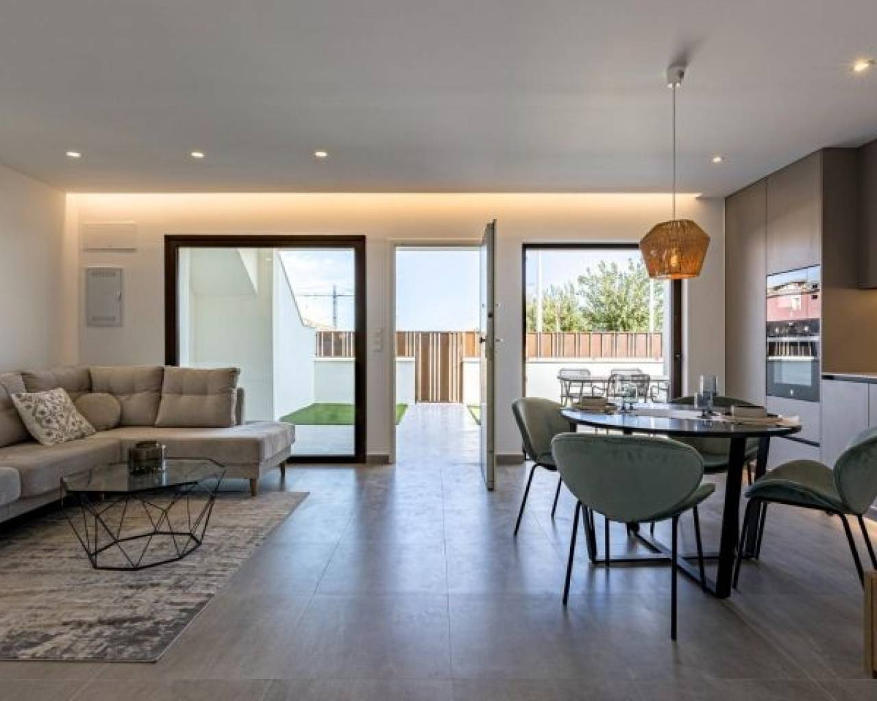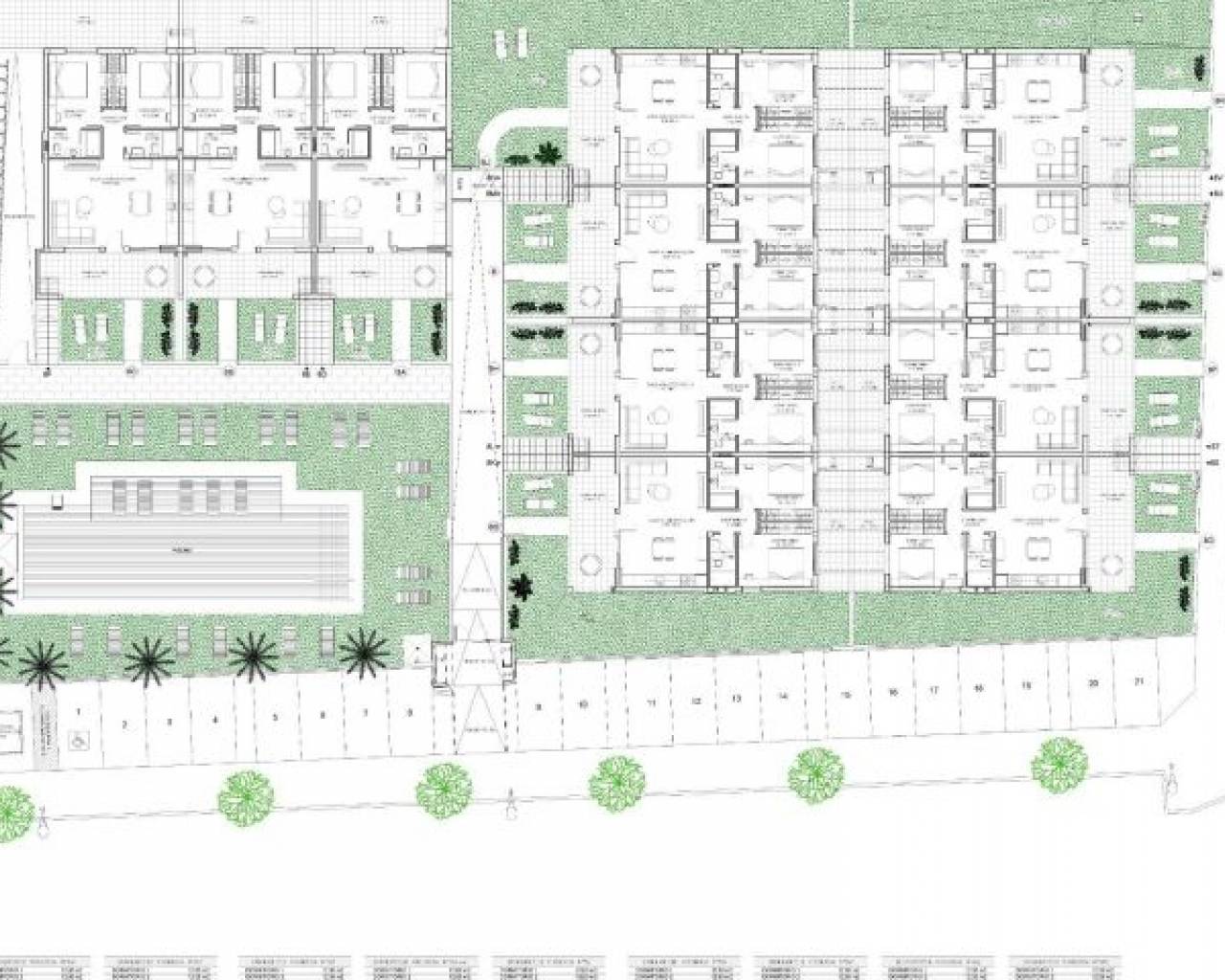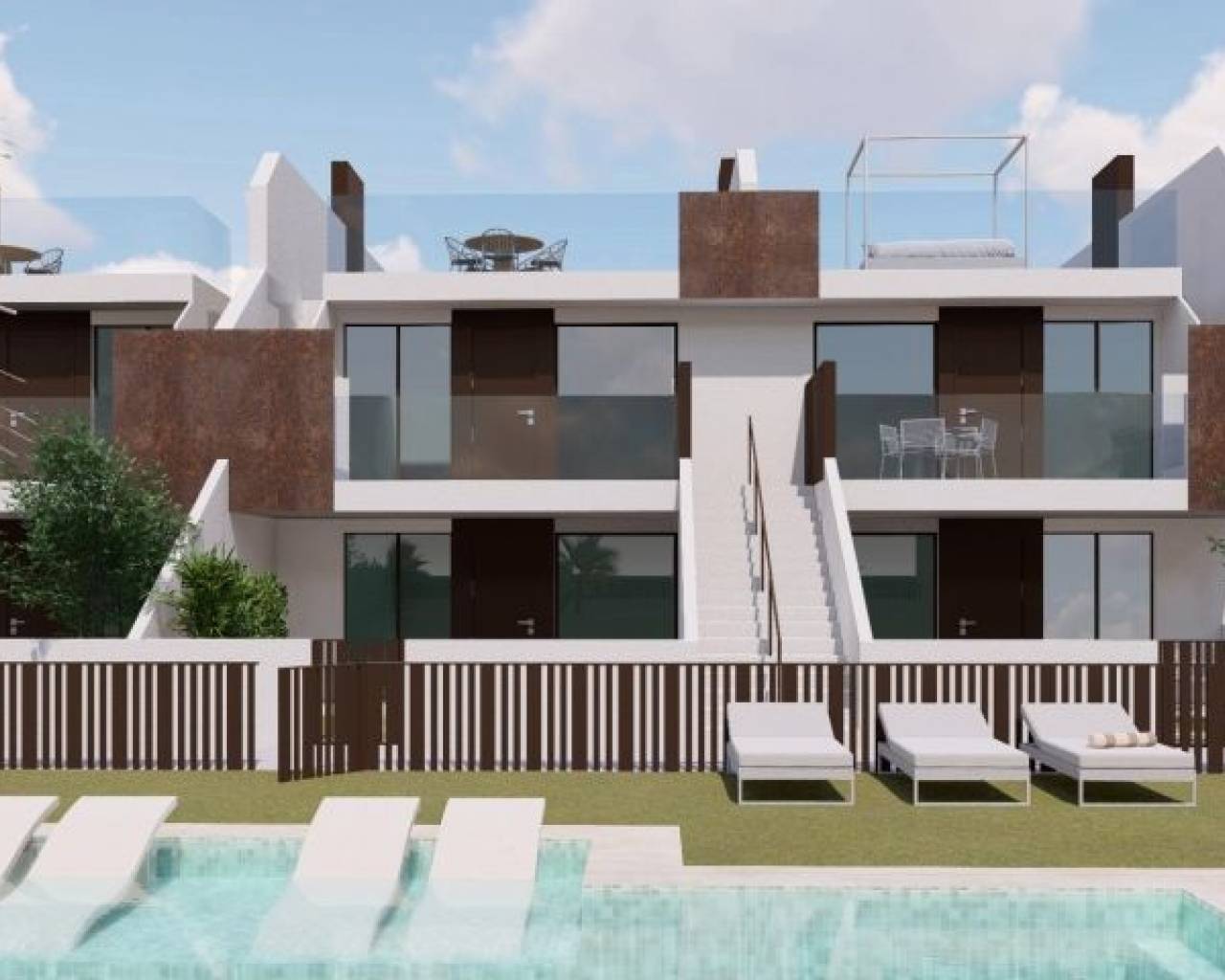 RESIDENCIAL DE OBRA NUEVA DE APARTAMENTOS BUNGALOW EN PILAR DE LA HORADADA Obra Nueva un exclusivo residencial compuesto por 22 apartamentos bungalow de primera calidad con acabados PORCELANOSA en Pilar de la Horadada. Modernos bungalows de 2 dormitorios, 2 baños, cocina americana con salón, armarios empotrados. Las viviendas de planta baja disponen de un amplio jardín acabado en césped artificial y en la planta superior disfrutará del sol todo el año en la terraza y solarium, así como de la zona comunitaria con piscina y una cómoda plaza de aparcamiento. Pilar de la Horadada es un típico pueblo español en la parte más meridional de la Costa Blanca. La gran calle principal tiene supermercados, muchas tiendas, restaurantes y bares y algunas plazas encantadoras. Las hermosas playas de Torre de la Horadada y Mil Palmeras con paseo marítimo de arena fina está a sólo 5 minutos. Los aeropuertos de Corvera (Murcia) y Alicante están respectivamente a 40 y 55 minutos.