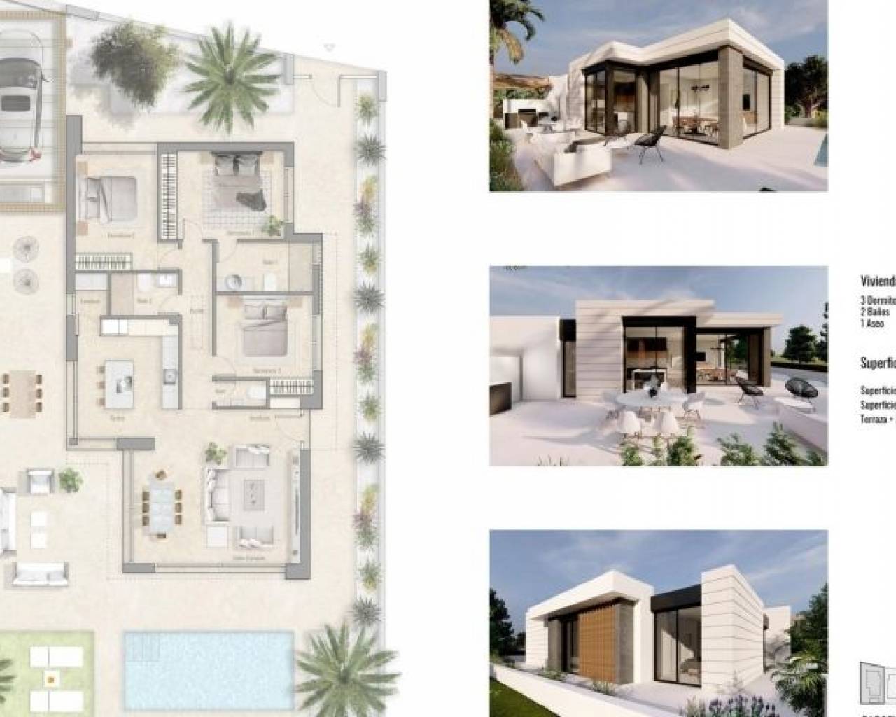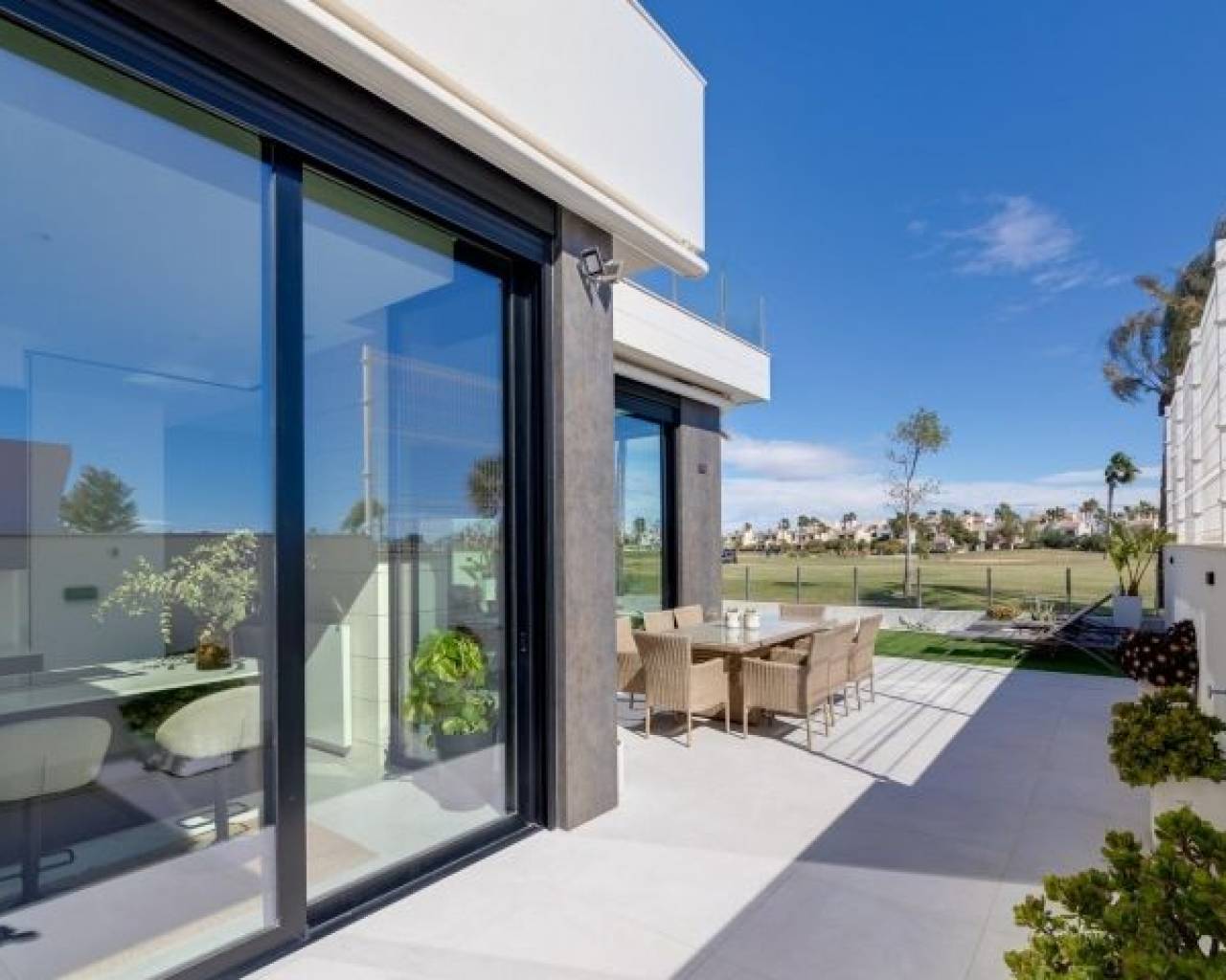 VILLAS DE OBRA NUEVA EN PILAR DE LA HORADADA EN EL CAMPO DE GOLF Residencial de obra nueva de 6 villas independientes en Pilar de la Horadada. Las villas de obra nueva de una sola planta tienen 3 dormitorios, 2 baños, aseo, cocina americana con salón, armarios empotrados, jardín privado con piscina privada y plaza de aparcamiento. Pilar de la Horadada es la ciudad más meridional y municipio de la Costa Blanca en la provincia de Alicante. La ciudad está situada en la frontera entre la Comunidad Valenciana y la región de Murcia. La ciudad de Pilar de la Horadada es un típico pueblo español situado a sólo 2 km de la costa y de las populares playas de Torre de la Horadada. En el centro de Pilar de la Horadada encontrará todos los servicios: tiendas, pastelerías, bancos, etc. a lo largo de la calle principal 'Calle Mayor'. También podrá disfrutar de un ambiente maravilloso cerca de la iglesia local, en la Plaza de la Iglesia, donde hay varias cafeterías. En Pilar de la Horadada también hay una red bien desarrollada de carriles bici y senderos para caminar, y también hay una gran oferta de diversas actividades deportivas. El campo de golf Lo Romero, de 18 hoyos, está a un corto trayecto en coche del pueblo. Los aeropuertos de Corvera (Murcia) y Alicante se encuentran a 40 y 55 minutos respectivamente.
