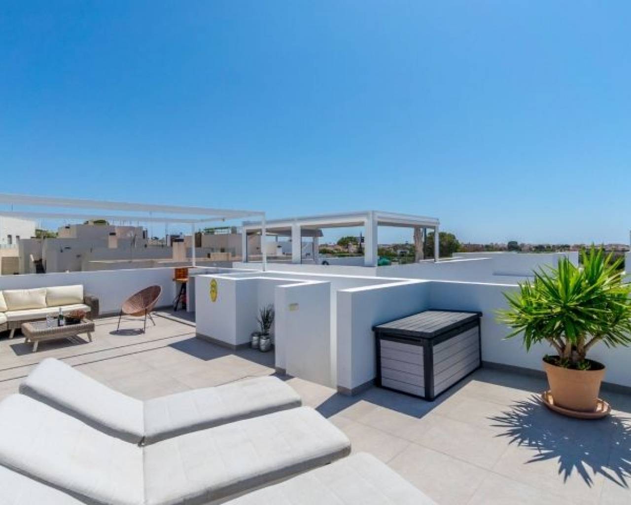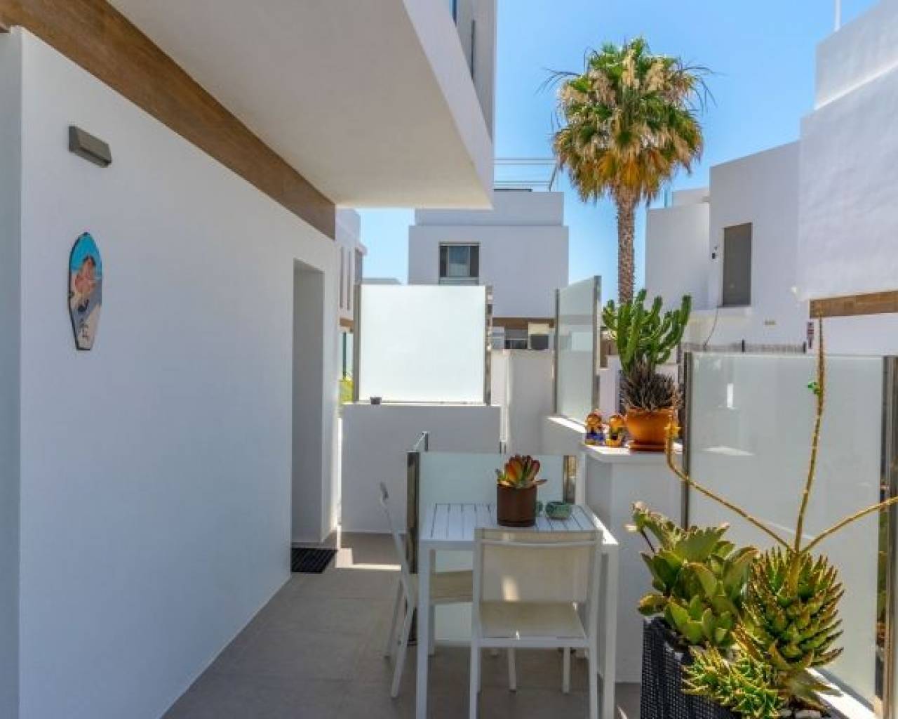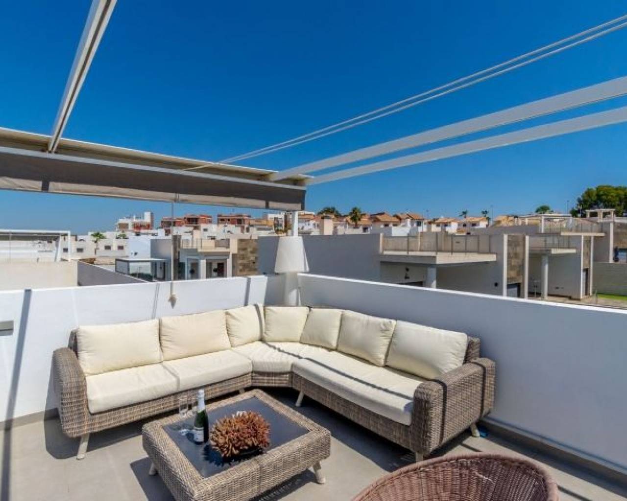 Esta hermosa villa, construida en 2018 y en buen estado, es un hogar ideal para quienes buscan comodidad y un estilo de vida soleado en la Costa Blanca. Con orientación suroeste, podrás disfrutar de días y noches soleadas. La propiedad está completamente amueblada, lo que la deja lista para entrar a vivir de inmediato. La propiedad ofrece: 3 amplios dormitorios 3 baños modernos, cada uno cuenta con calefacción por suelo radiante. Superficie habitable: 199 m² Parcela: 204 m² Terrazas: La villa cuenta con varias zonas exteriores privadas: El dormitorio principal tiene una terraza privada de 6.58 m². Además, hay una espaciosa azotea de 47.06 m² que ofrece espacio exterior adicional y oportunidades para tomar el sol y disfrutar de las vistas. Esta cuenta también con una cocina exterior con suministro de agua. Piscina privada climatizada para disfrutar todo el año Parking privado con espacio para 2 coches Interior y distribución: En la planta baja encontrarás un salón-cocina de concepto abierto, perfecto para socializar. Desde esta planta también tienes acceso directo a la piscina y a la zona exterior inferior, lo que facilita disfrutar de los días soleados. Esta planta también cuenta con un baño. Subiendo a la segunda planta encontrarás tres dormitorios y dos baños. El dormitorio principal tiene un baño en-suite propio, que proporciona privacidad y comodidad adicionales. Desde la segunda planta también hay acceso a la fantástica azotea. Las instalaciones y características incluyen: Vistas al mar y a la piscina Sistema de alarma y puerta reforzada para mayor seguridad Iluminación exterior e interior Persianas eléctricas Aire acondicionado central y calefacción central Intercomunicador Trastero Armarios empotrados Acceso a zonas verdes comunes y piscina comunitaria (además de la privada) La zona de Villamartín Villamartín es una urbanización bien desarrollada y cosmopolita en la Costa Blanca Sur, conocida por su vibrante comunidad y excelentes instalaciones. La zona presume de alrededor de 320 días de sol al año y una temperatura media anual de aproximadamente 20°C, lo que contribuye a un agradable clima mediterráneo durante todo el año. Villamartín es un paraíso para los amantes del golf. Aquí encontrarás el histórico Campo de Golf Villamartín, inaugurado en 1972 y diseñado por Robert Dean Puttman. Este campo de 18 hoyos (par 72) es reconocido como uno de los mejores de la región, y ha sido sede de rondas clasificatorias para el European Tour. El campo se caracteriza por su vegetación madura y ofrece fantásticas vistas al mar. El restaurante de la casa club también tiene una terraza en la azotea con excelentes vistas al hoyo 18. Además de Villamartín Golf, hay otros campos de golf reconocidos en las inmediaciones, incluidos Las Ramblas Golf, Las Colinas Golf & Country Club, La Finca Golf y Lo Romero Golf. La zona también es conocida por su animado ambiente con una variedad de restaurantes, bares y tiendas. La famosa Villamartín Plaza es un punto de encuentro popular con una amplia selección de opciones gastronómicas y de ocio. Grandes centros comerciales como Zenia Boulevard también se encuentran cerca. Las hermosas playas a lo largo de Orihuela Costa, incluidas las playas con "Bandera Azul" como La Zenia, Playa Flamenca y Cabo Roig, están a poca distancia en coche. Esta villa es perfecta para quienes buscan una combinación de privacidad, golf y fácil acceso a todo lo que Villamartín y la Costa Blanca tienen para ofrecer.