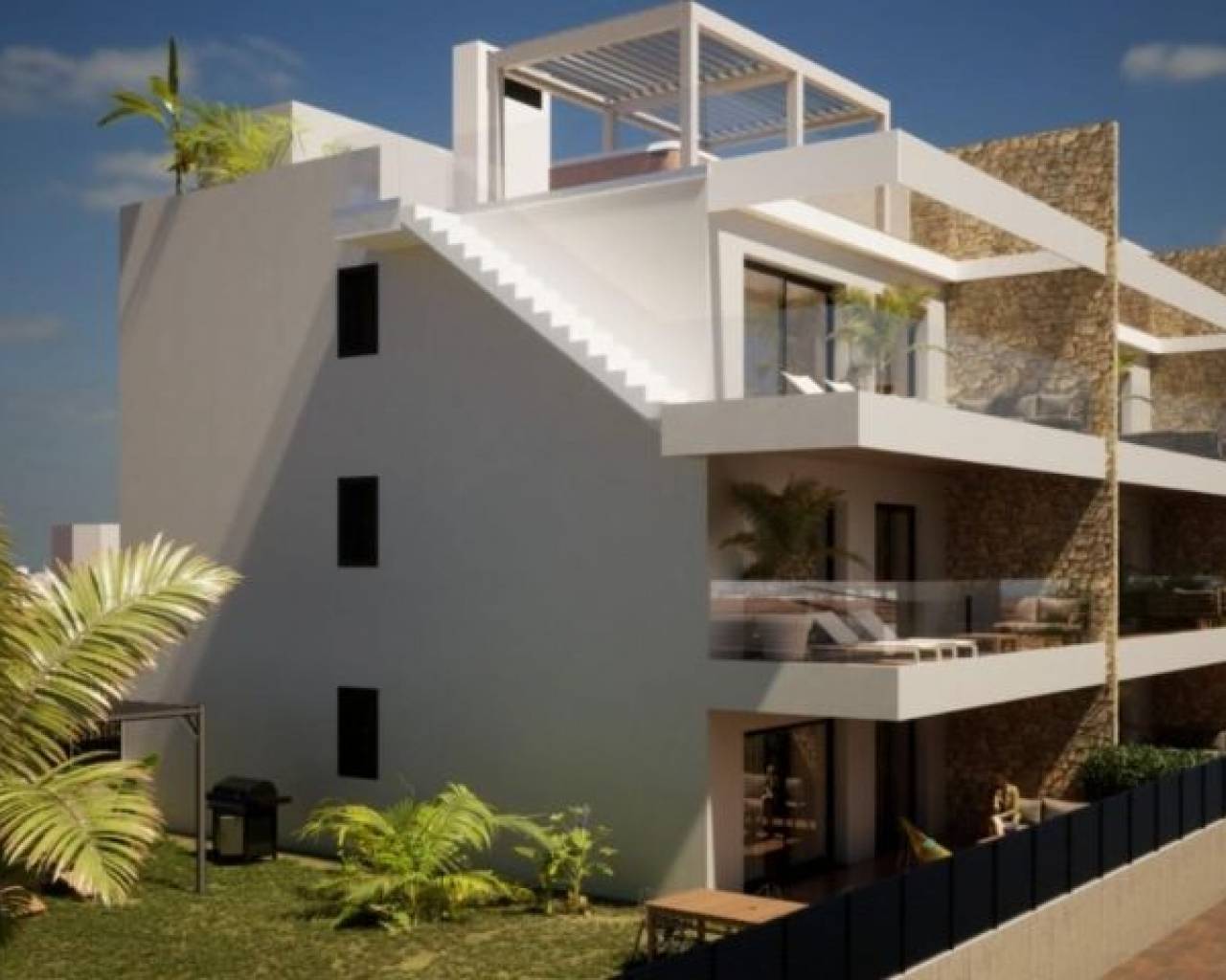 COMPLEJO RESIDENCIAL DE OBRA NUEVA CON VISTAS AL MAR EN FINESTRAT Complejo residencial de obra nueva con vistas al mar en Finestrat. Complejo formado por 9 bloques de 9 apartamentos cada uno. Hay 3 tipos de viviendas: 27 áticos con solarium privado, 27 en primera planta con terrazas y 27 plantas bajas con jardín privado. Todo dentro de un entorno privado y exclusivo, para disfrutar de actividades deportivas y de ocio. Las viviendas tienen su diseño moderno y exclusivo, y están equipadas con las últimas tecnologías constructivas aplicadas al confort, aislamiento térmico y acústico, aerotermia, aire acondicionado, etc. Diseñadas en un entorno privado de lujo con piscina comunitaria con zona separada para niños y adultos. Amplias zonas ajardinadas privadas. Gimnasio con jacuzzi, vestuarios y duchas. Zona de relax. Zona de juegos infantiles. Desde aquí podrá disfrutar de unas privilegiadas vistas al mar Mediterráneo, así como del fantástico y espectacular Skyline de Benidorm. Finestrat situado en la comarca de la Marina Baixa de la Costa Blanca, cerca de la vecina Benidorm y a unos 40 kilómetros de la ciudad de Alicante y del aeropuerto internacional. Benidorm está a sólo cinco minutos en coche de las propiedades y ofrece todos los servicios que pueda necesitar, incluyendo tiendas, bares, restaurantes, supermercados, bancos, farmacias y varias escuelas privadas internacionales. Cerca de las playas de Levante, Poniente y Cala de Finestrat, con más de 6km de longitud que se encuentran entre las mejores de Europa galardonadas por la Unión Europea con Banderas Azules. Todos los servicios de ocio como los parques temáticos de Aqua Natura, Terra Mítica, Terra Natura, Aqualandia y Mundomar, los campos de Golf Sierra Cortina y Villaitana, senderismo y escalada en el Puig Campana un marco natural incomparable o disfrutar de los deportes náuticos.