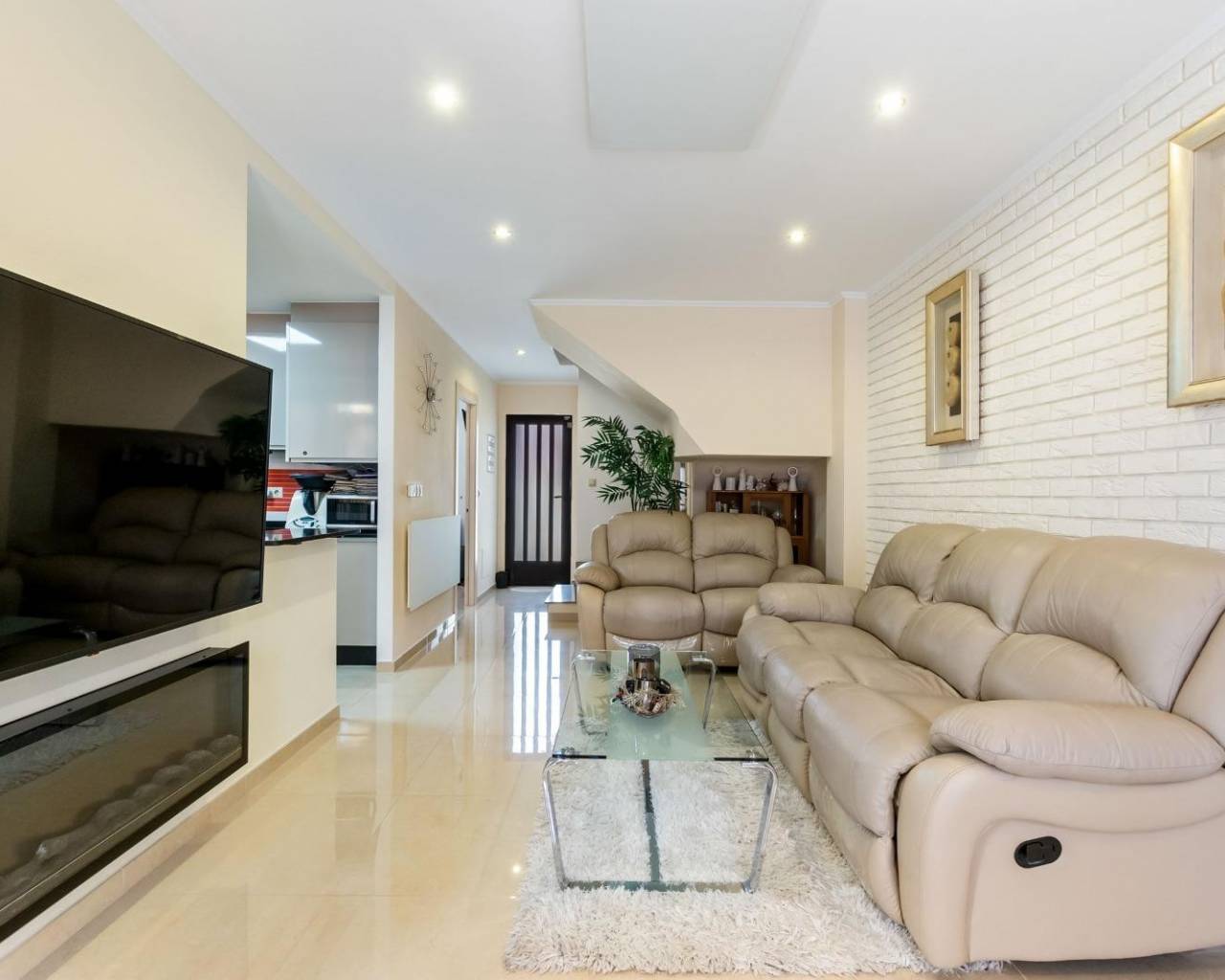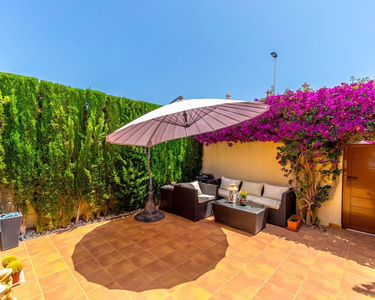 Este magnífico adosado de dos plantas combina privacidad, confort y diseño contemporáneo en una vivienda completamente reformada y decorada con un gusto exquisito. Dispone de tres amplios dormitorios con armarios empotrados y dos baños modernos, ofreciendo un espacio funcional y elegante. La cocina totalmente equipada se integra con un salón luminoso y acogedor, amueblado con piezas de alta calidad, incluyendo dos sofás de cuero. Los espacios exteriores son un verdadero privilegio: una terraza delantera de 43 m² con muebles de ratán, un patio trasero íntimo, un balcón en la planta superior y un solárium privado de 40 m², perfectos para disfrutar del sol y del estilo de vida mediterráneo durante todo el año. La vivienda se vende completamente equipada, incluyendo tres televisores (50" a 65"), electrodomésticos de primeras marcas como lavavajillas Bosch y calentador Ariston Wi-Fi, aire acondicionado Panasonic, calefacción por infrarrojos. En materia de seguridad y confort, cuenta con sistema de alarma, cámaras de vigilancia, puertas y ventanas antirrobo de alta resistencia, rejas de seguridad y grifería Grohe. En el exterior, el jardín con iluminación ambiental, riego automático y toldos aporta el toque perfecto. Totalmente renovado —suelos, baños, habitaciones y exteriores—, este adosado se entrega listo para entrar a vivir, con todo el mobiliario y decoración que aparece en las fotografías. Una propiedad única para quienes buscan calidad, estilo y tranquilidad en una ubicación privilegiada.