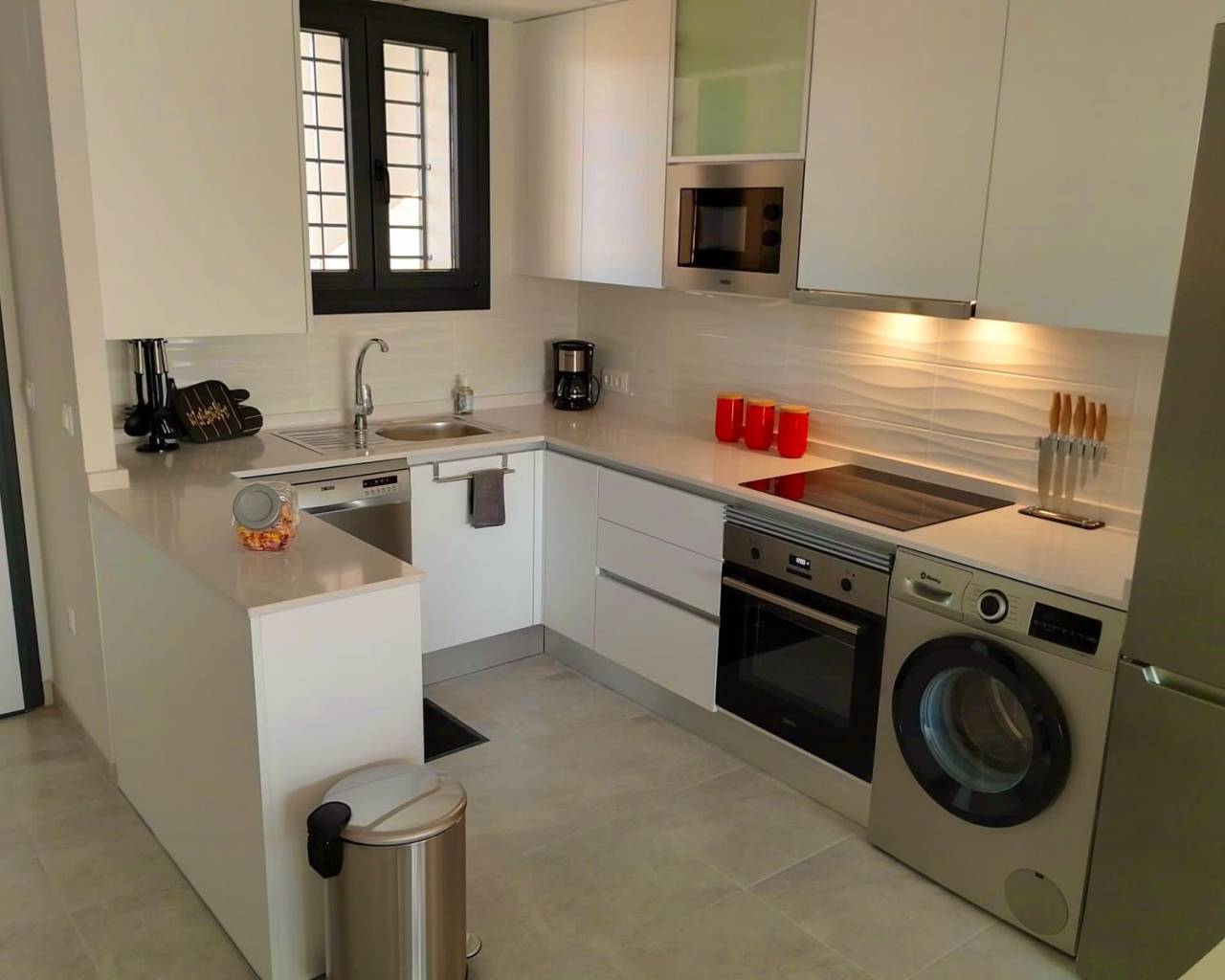Apartamento de 2 habitaciones con plaza de aparcamiento en una exclusiva zona residencial de Orihuela Costa. Este apartamento se encuentra en la tercera planta de un edificio con ascensor en un complejo residencial con piscina comunitaria, zona de juegos infantil y zonas verdes. Está situado en una zona tranquila y segura de Orihuela Costa. El apartamento consta de un salón amplio y luminoso, una cocina independiente, dos habitaciones dobles, un baño con ducha y una gran terraza. Este apartamento de nueva construcción está totalmente equipado y amueblado, dispone de aire acondicionado (frío/calor) y está listo para entrar a vivir de inmediato. Una plaza de aparcamiento subterráneo está incluida en el precio. En las inmediaciones se encuentran cuatro conocidos campos de golf (Las Ramblas, Villamartín Golf, Las Colinas Golf & Country Club y Real Club de Campoamor), varios centros comerciales, restaurantes, bares y supermercados. Además, a tan solo 10 minutos en coche se puede acceder a diversas playas de arena (Punta Prima, La Zenia, Campoamor, etc.). En resumen, es el lugar ideal para relajarse y disfrutar del clima mediterráneo, así como de todos los servicios e instalaciones de ocio disponibles. Perfecto para vivir en España.
