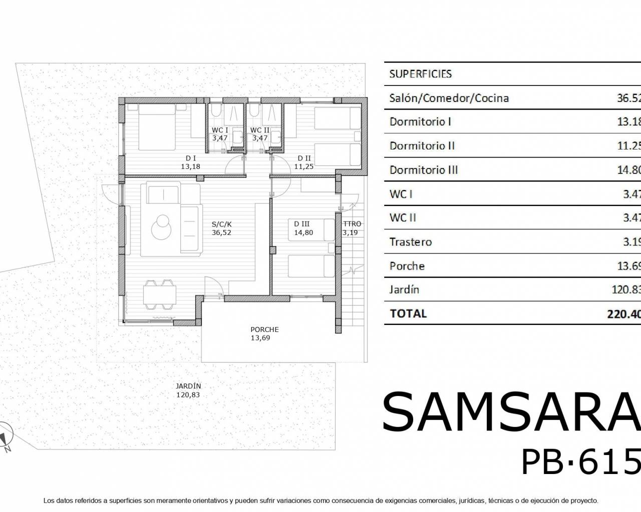 Bungalow en planta baja situado en un amplio residencial con bonitas zonas verdes ajardinadas y una gran piscina comunitaria. Vivienda de 102.96m² que se distribuye en un amplio salón comedor unido a una bonita cocina abierta, très dormitorios dobles ,uno de ellos en suite con baño incorporado , un baño independiente ,trastero de 3.19m² y acceso a dos maravillosas terrazas con bonitas zonas verdes ajardinadas de 120.83m² en total sumando ambas.