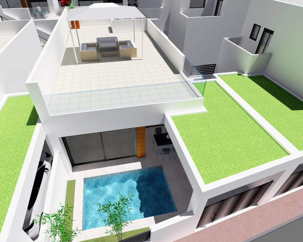 Espectacular Villa Independiente en venta, en las afueras de Bigastro, municipio asentado en pleno corazón de la Vega Baja, con todos los servicios básicos que una ciudad puede ofrecer, tales como tiendas, supermercados, centro médico, farmacias, colegios, bares y restaurantes. La vivienda esta ubicada en una zona residencial muy tranquila a 200m del Colegio San José de Calasanz y a 300m de tiendas, bares y restaurantes. Buenas comunicaciones con la Carretera Nacional CV - 95 que te permite desplazarte con facilidad a otras grandes Ciudades como Orihuela, Torrevieja, etc. Amplia Villa de dos plantas situada en una parcela de 161.87m² con bonitas zonas verdes ajardinadas, plaza de aparcamiento descubierta y una maravillosa piscina privada. Interior se distribuye en la planta baja cuenta con  un amplio salón comedor unido a una cocina americana, un dormitorio doble y un baño independiente con ducha. En la planta alta cuenta con dos dormitorios dobles ambos con baños en suite con plato de ducha.  La villa cuenta con armarios incorporados en todas las habitaciones.  .