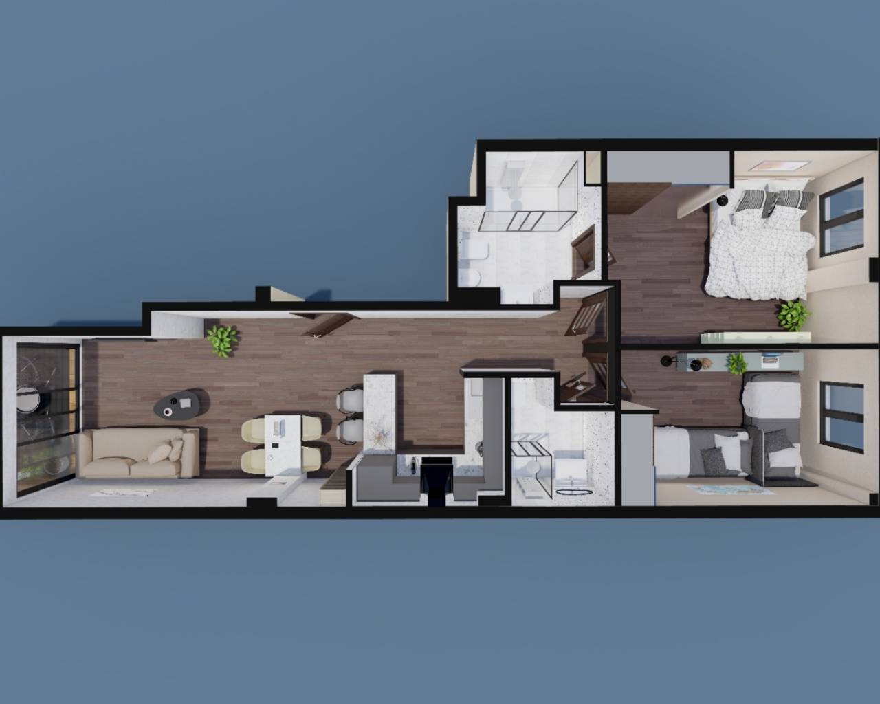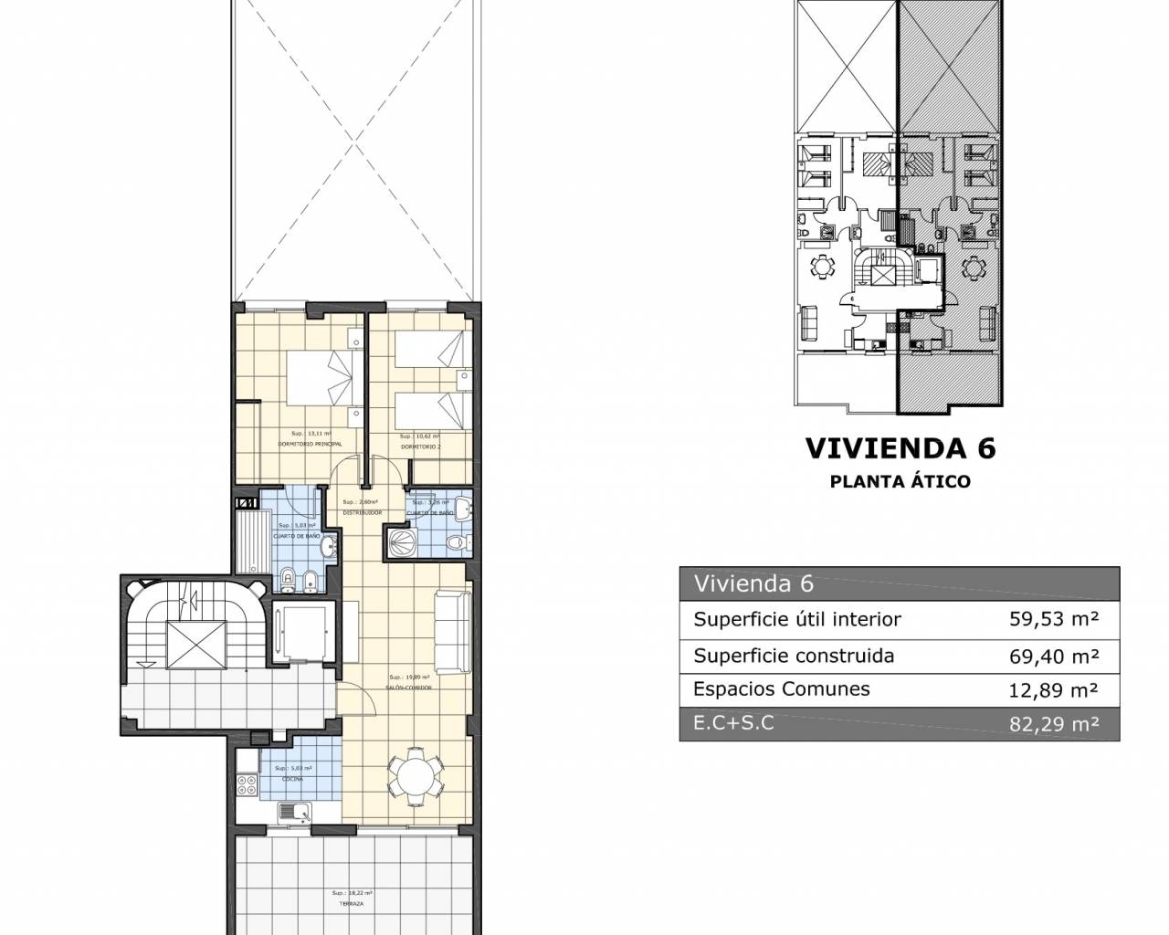 Ático con plaza de aparcamiento privada. Ático de 82.29m² que se distribuye en un amplio salón comedor unido a una cocina abierta y acceso a una terraza de 18.72m², dos dormitorios dobles, uno de ellos en suite con baño, y un baño independiente.