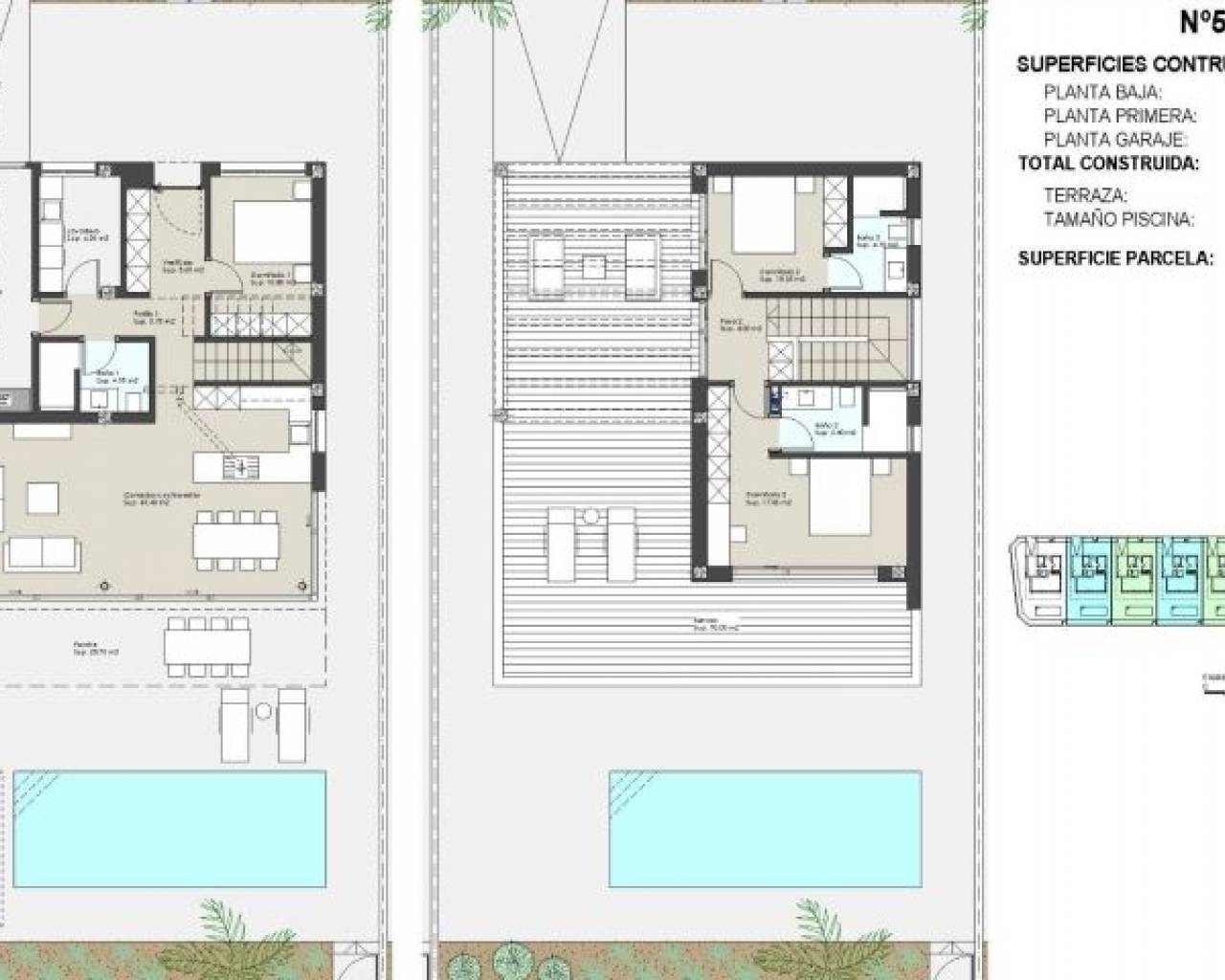VILLAS NEUVES À ROLDAN Villas modernes neuves à Roldan, Torre Pacheco Villas de 199 m² construites sur des parcelles de 385 m², 438 m² et 490 m². Les villas ont 3 chambres à coucher ; deux d'entre elles avec salle de bain complète. Cuisine meublée avec des matériaux de première qualité à choisir par le propriétaire, y compris les appareils électriques, suivant un concept ouvert avec la salle à manger entourée de grandes fenêtres qui fournissent tout au long de la journée une lumière agréable et un accès direct à la piscine et les zones de jardin privé complètement fini. Climatisation (chaud/froid) par gaines incluse. En soignant les moindres détails des finitions, en utilisant des matériaux de la plus haute qualité, en personnalisant le design et le luxe sans oublier le confort maximum, nous parvenons à profiter des maisons aussi bien en été qu'en hiver doux, les rendant ainsi habitables toute l'année. Garage pour 1 véhicule et en plus, parking extérieur pour un autre véhicule, avec entrée séparée. Villas situées à proximité des meilleurs terrains de golf, dans la municipalité de Torre Pacheco. Ce quartier dispose de tous les services qu'un lieu de vie doit avoir : supermarchés, écoles, centres médicaux, centres sportifs, pharmacies, etc... Parmi ces écoles, on trouve la King's College British School of Murcia, qui se trouve à seulement 8 minutes en voiture de notre lotissement. Il s'agit de la seule école internationale de la région inspectée par un organisme externe accrédité par le ministère britannique de l'éducation pour l'inspection des écoles britanniques à l'étranger. Sans oublier la proximité de l'autoroute RM-19 qui relie notre résidence à Murcie, à 30 minutes, et à l'aéroport de Corvera (Murcie), à 20 minutes. L'aéroport d'Alicante est à 1 heure. Pour se rendre à Carthagène, il faut 25 minutes en voiture. Le centre commercial Dos Mares à San Javier est à 15 minutes de route et l'Espacio Mediterraneo à Carthagène à 22 minutes. La distance jusqu'à la plage la plus proche, qui se trouve sur la Mar Menor à Los Alcazares, est de 18 km, soit 19 minutes en voiture.
