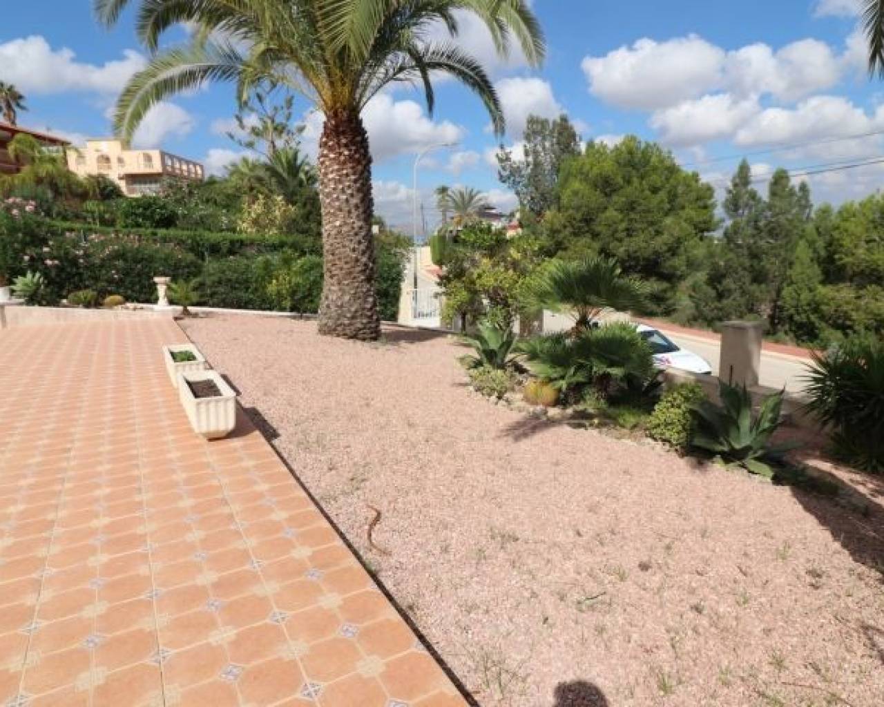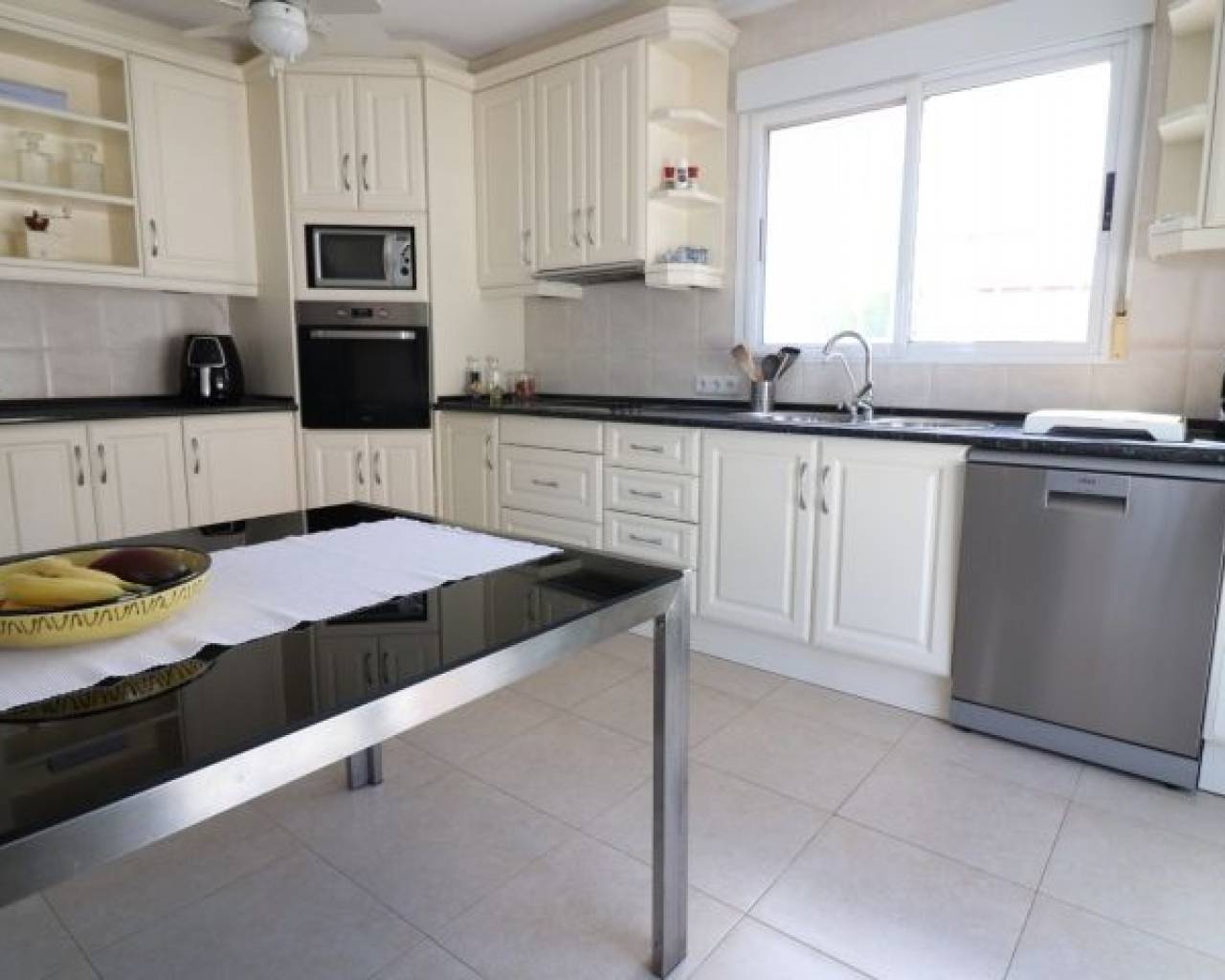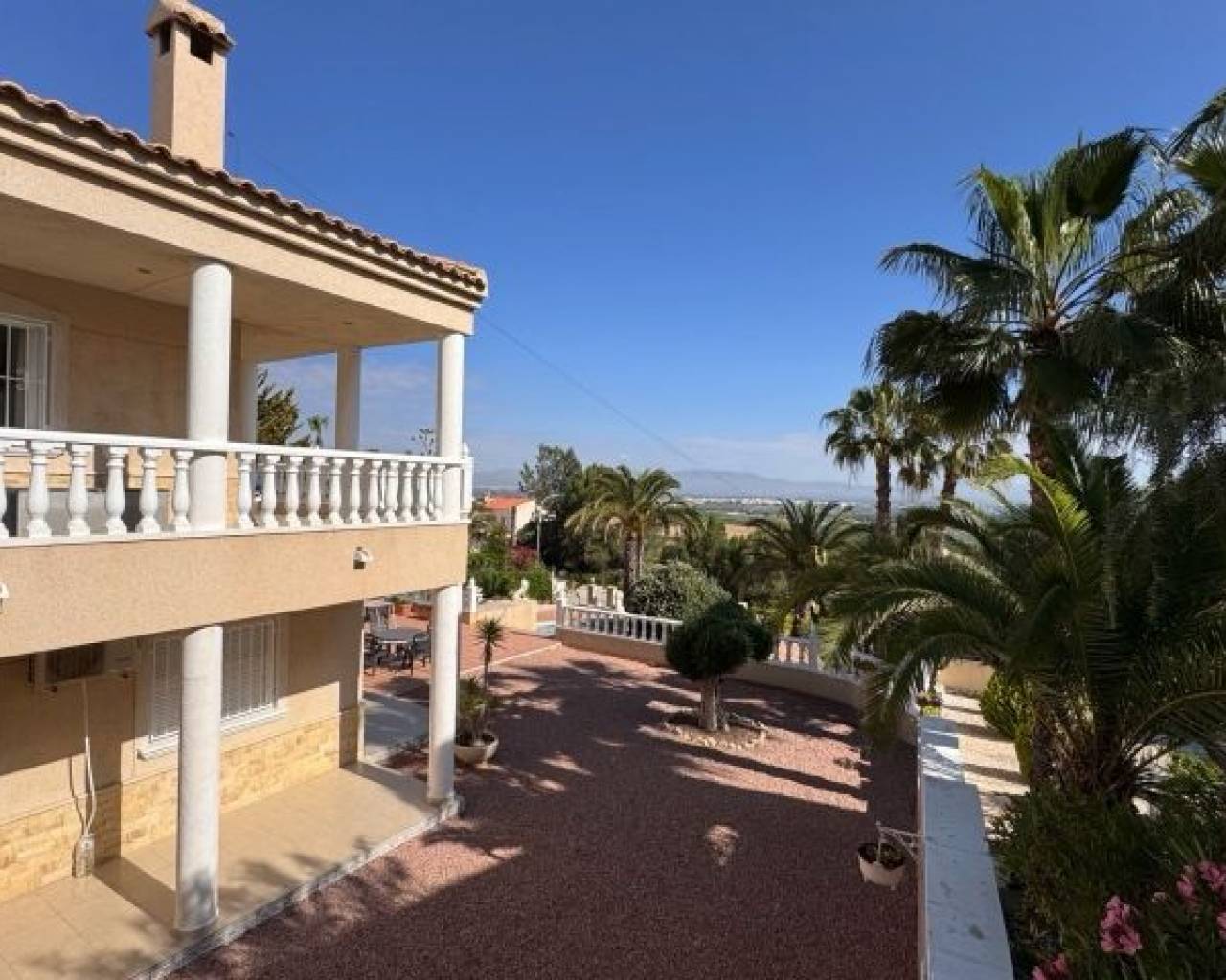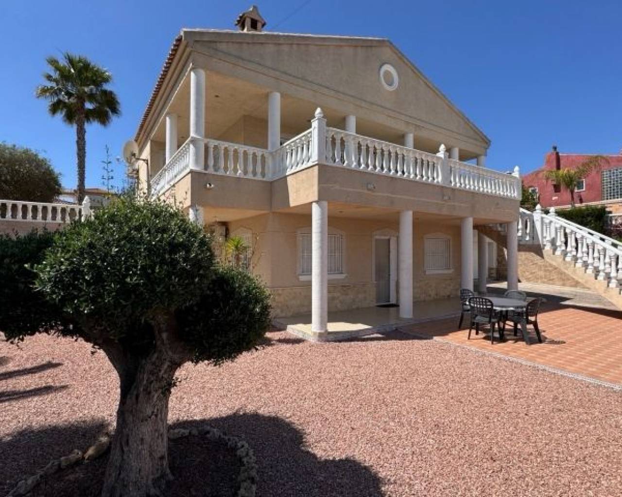Cette imposante villa individuelle de trois chambres de 191 m2 à Lomas de La Juliana est située dans un quartier résidentiel très recherché, avec un club de tennis à l'entrée et l'hôtel La Finca 5*, un spa et un parcours de golf juste à côté, où vous pourrez vous trouverez également une variété de restaurants et de magasins. Les principales chaînes de supermarchés se trouvent à Almoradi et Benijofar, à seulement 5 minutes en voiture. Les plages du littoral sont à environ 20 minutes en voiture. Cette maison exceptionnelle occupe un terrain paysager privé de 1220 m2 avec les vues les plus étendues que vous trouverez dans la région. Le salon principal de la villa est accessible par un escalier extérieur à une terrasse couverte en forme de L, qui donne ensuite accès au joli salon lumineux, doté d'un ensemble de portes coulissantes et de trois ensembles de fenêtres, dotés d'une cheminée à foyer ouvert ; incroyable cuisine équipée/salle de petit-déjeuner ; chambre double et une salle de douche familiale. Le rez-de-chaussée de la propriété est accessible par l'extérieur et comprend un salon, une arcade menant à la cuisine équipée, une salle de bains et deux chambres doubles. Le jardin est en galets et carrelage avec une longue allée menant à deux garages ; la piscine est entourée de carrelage et il y a beaucoup d'arbres matures, de buissons et de palmiers autour. Les extras comprennent le chauffage au sol dans tout le rez-de-chaussée, la climatisation, des armoires encastrées dans toutes les chambres et un système d'irrigation.