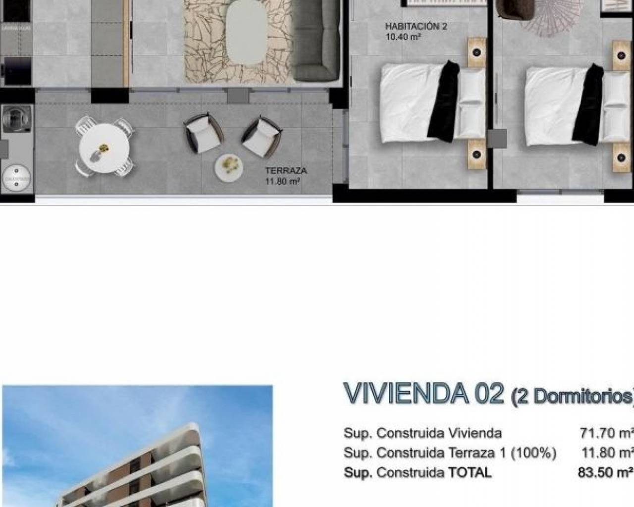 Appartements neufs modernes à Santa Pola, à seulement 500 mètres de la plage Emplacement privilégié au cœur de Santa Pola Ce nouveau programme immobilier exclusif est situé dans le centre animé de Santa Pola, l'une des villes côtières les plus charmantes de la province d'Alicante. À seulement 500 mètres de la plage et du port de plaisance, les résidents peuvent profiter du style de vie méditerranéen avec tout à leur portée. La ville d'Alicante n'est qu'à 20 km et l'aéroport international d'Alicante-Elche à seulement 15 km, offrant ainsi une excellente connectivité. Appartements contemporains conçus pour le confort Le bâtiment se compose de 15 logements modernes avec 2 chambres et 2 salles de bains, ainsi que des unités optionnelles avec 1 ou 3 chambres et des espaces de rangement optionnels pour répondre à différents besoins. Chaque appartement est conçu avec des intérieurs lumineux et spacieux, avec un salon et une salle à manger ouverts sur une cuisine équipée. De grandes portes coulissantes mènent à des terrasses privées, parfaites pour profiter du climat doux de la Costa Blanca. Suites parentales spacieuses et équipements haut de gamme Les chambres principales mesurent jusqu'à 20 m² et comprennent une salle de bains privative. Certaines dispositions offrent de généreux dressings. Les penthouses disposent de vastes solariums équipés d'un espace barbecue, d'une pré-installation pour un jacuzzi, de douches extérieures et de connexions TV et électriques, ce qui les rend parfaits pour se divertir en plein air toute l'année. Profitez du style de vie méditerranéen Santa Pola est réputée pour sa beauté naturelle et ses innombrables possibilités de loisirs. La ville offre des plages immaculées et des criques idéales pour bronzer, faire de la plongée avec tuba et pratiquer des sports nautiques. À seulement 20 minutes en bateau se trouve l'île de Tabarca, célèbre pour ses eaux cristallines, sa réserve marine et sa gastronomie méditerranéenne. Pour les amoureux de la nature, le parc naturel Las Salinas de Santa Pola offre des sentiers de randonnée spectaculaires et des expériences uniques d'observation des oiseaux. Parfaitement connecté pour votre confort Grâce à son emplacement stratégique, ce complexe offre un accès facile aux services essentiels, aux centres commerciaux et aux installations sportives. Les amateurs de golf pourront rejoindre les meilleurs parcours, tels que El Plantío Golf, en moins de 25 km. La ville d'Alicante, avec ses attractions culturelles et gastronomiques, n'est qu'à 30 minutes en voiture. Une maison idéale ou une opportunité d'investissement Que vous recherchiez une résidence permanente, une maison de vacances ou un investissement locatif, ces appartements neufs à Santa Pola allient design moderne, confort et emplacement imbattable. Contactez-nous dès aujourd'hui pour réserver votre appartement et commencer à profiter du meilleur de Santa Pola et de la Costa Blanca.