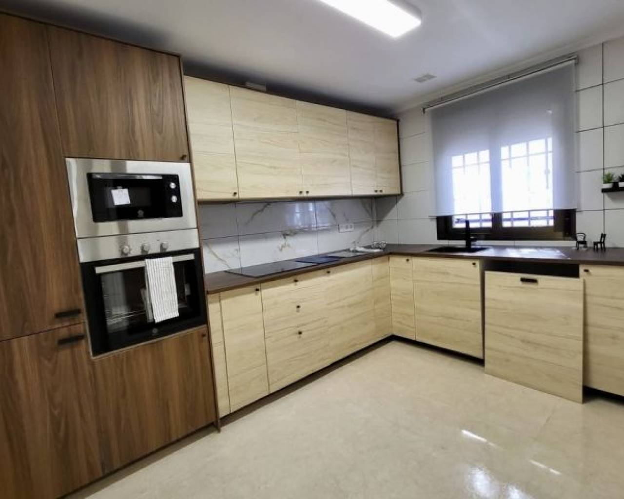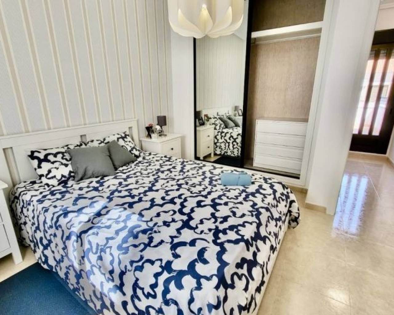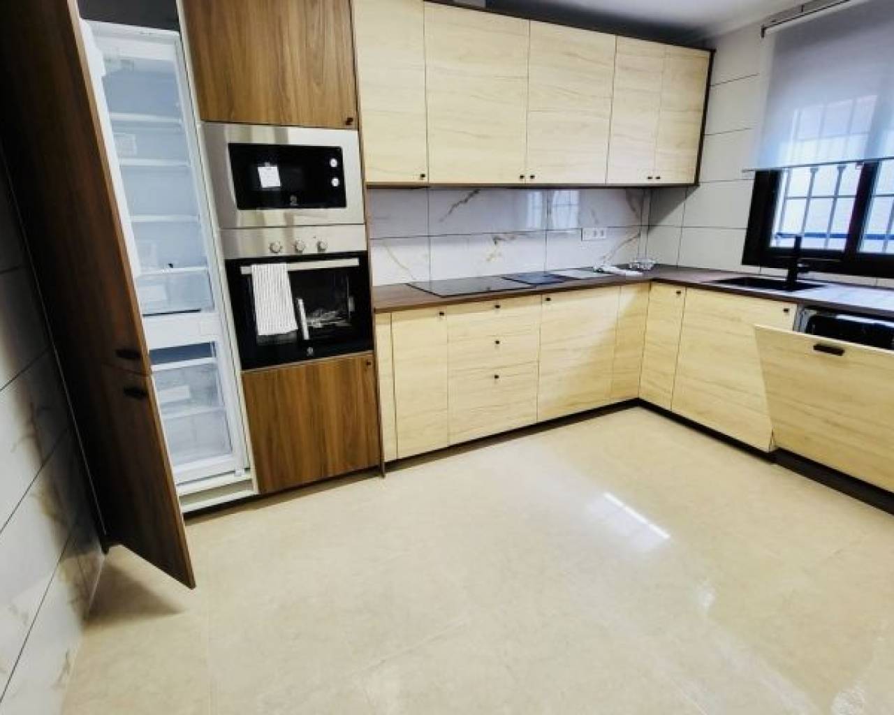 Élégante maison de ville entièrement rénovée offrant 3 chambres spacieuses et 3 salles de bains modernes. La propriété dispose d'une cuisine spacieuse et contemporaine équipée d'électroménagers neufs et d'un mobilier neuf de haute qualité, le tout inclus dans le prix de vente. Le salon-salle à manger lumineux et ouvert crée une atmosphère chaleureuse, tandis que chaque chambre est équipée de placards intégrés pour un rangement optimal. La villa est située sur un terrain d'environ 100 m² avec un jardin privé. Les résidents bénéficient d'un accès à une piscine commune et à des espaces verts paysagers. Un parking souterrain et un débarras d'environ 12 m² sont également disponibles en option.