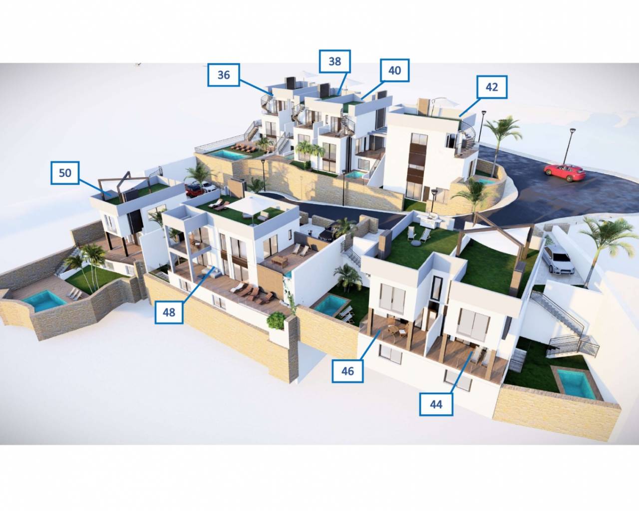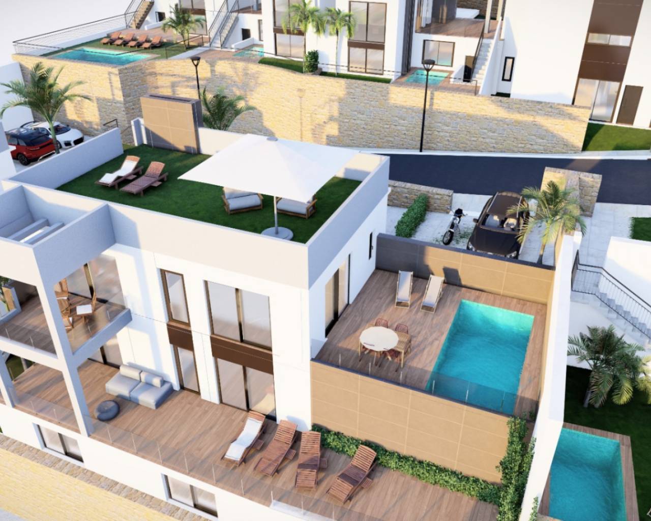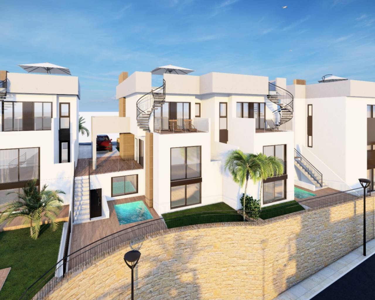 Villa  jumelée de deux étages située sur un terrain de 176.00m² avec de beaux espaces verts entourant la maison, une grande piscine privée de 2.5X4M  et une place de parking non couverte. Intérieur de la maison de 143,40m² qui sont répartis dans un salon spacieux attenant à une belle cuisine américaine avec bar pour le petit-déjeuner sur la péninsule, et des toilettes invités au rez-de-chaussée, à l’étage supérieur deux chambres doubles et une salle de bain séparée avec chauffage au sol, Accès depuis les deux chambres à une belle terrasse de 16,80m².