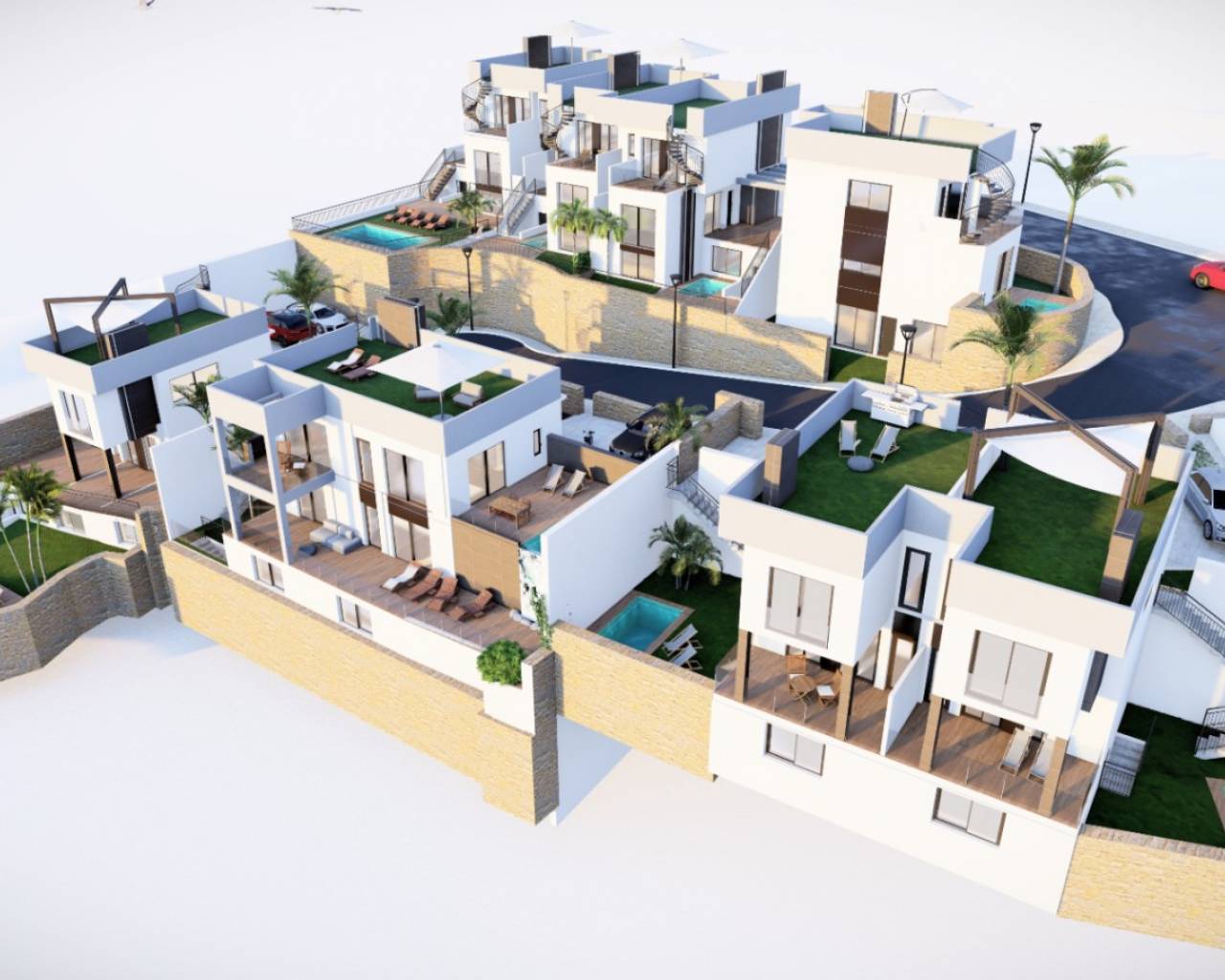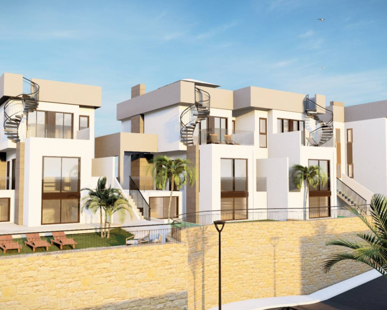 Villa  jumelée de deux étages située sur un terrain de 176.00m² avec de beaux espaces verts entourant la maison, une grande piscine privée de 2.5X4M  et une place de parking non couverte. Intérieur de la maison de 143,40m² qui sont répartis dans un salon spacieux attenant à une belle cuisine américaine avec bar pour le petit-déjeuner sur la péninsule, et des toilettes invités au rez-de-chaussée, à l’étage supérieur deux chambres doubles et une salle de bain séparée avec chauffage au sol, Accès depuis les deux chambres à une belle terrasse de 16,80m².