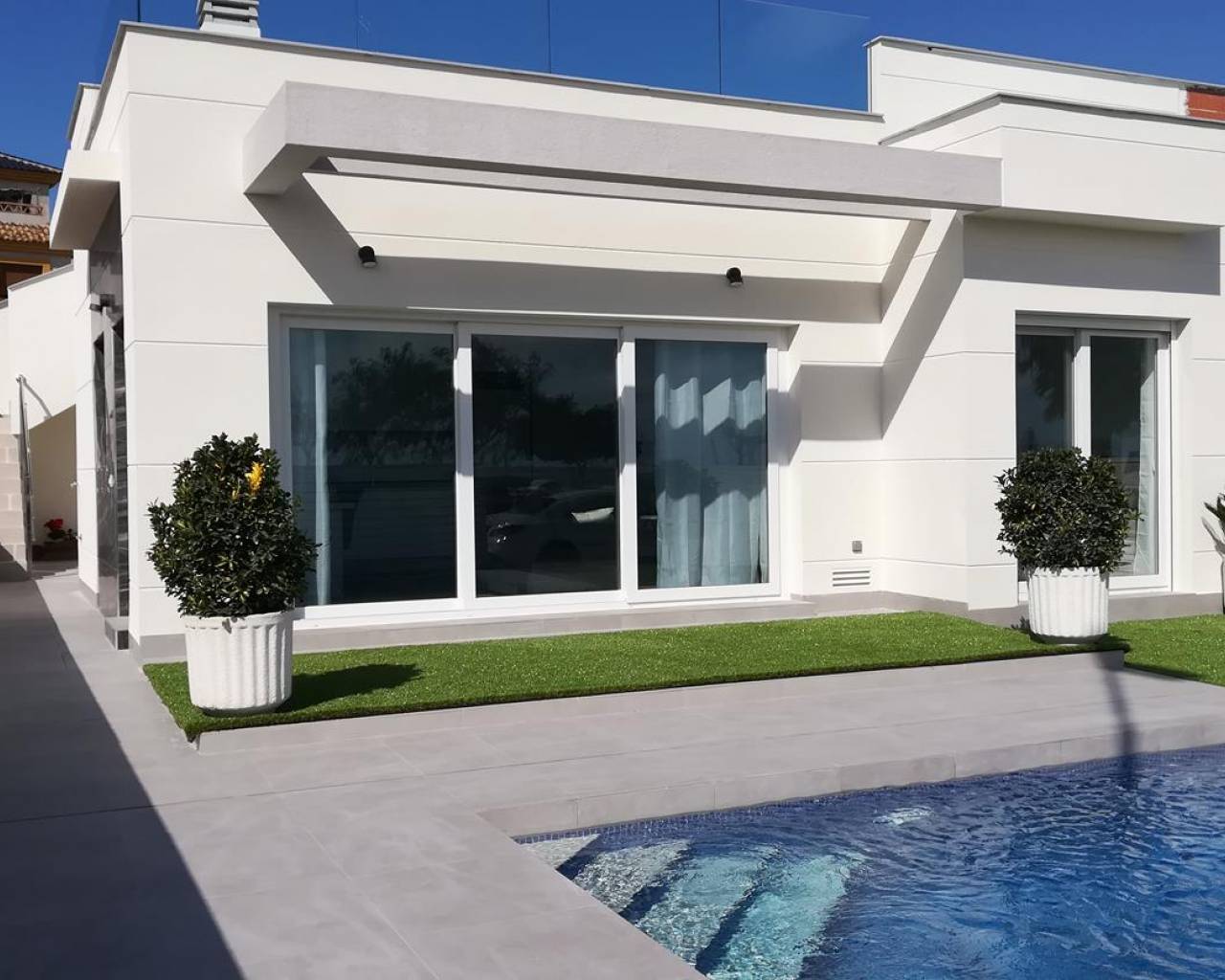 Fantastique villa jumelée à vendre à La Herrada, Los Montesinos, dans un quartier résidentiel très calme sans renoncer aux services de base qu’une ville peut offrir. À moins de 200 m, il y a un grand supermarché, des pharmacies, etc. À moins de 1 km, vous trouverez le centre civique de Los Montesinos avec une grande variété de restaurants et de bars, où vous pourrez profiter de la meilleure expérience gastronomique. À 10 km des meilleures plages de Torrevieja, avec ses bars de  plage, sa foire et une variété d’activités de loisirs  qui ne vous permettront pas de vous ennuyer.  Villa de plain-pied avec solarium, située sur un terrain de 165,99m² avec une belle piscine privée dans le jardin et une place de parking non couverte. Intérieur de la maison de 85,65m² construits qui sont répartis dans un salon spacieux attenant à une belle cuisine américaine entièrement équipée, deux chambres doubles, dont une en suite avec salle de bain attenante, une chambre simple, une salle de bain séparée et l’accès aux magnifiques terrasses extérieures. Sol couvert avec un grand solarium de 80.00m2 donnant sur La Laguna.