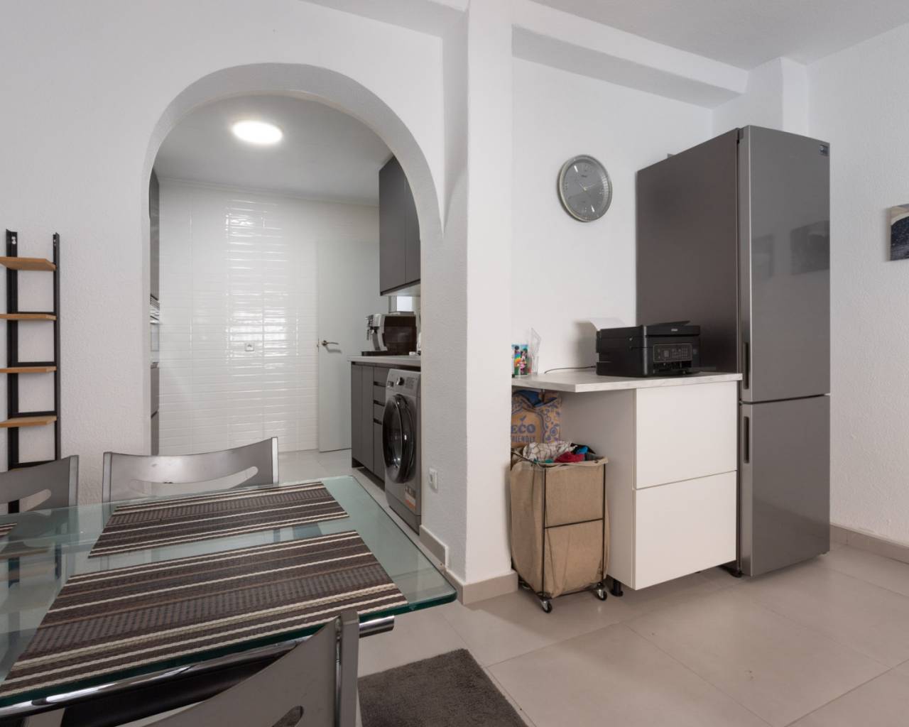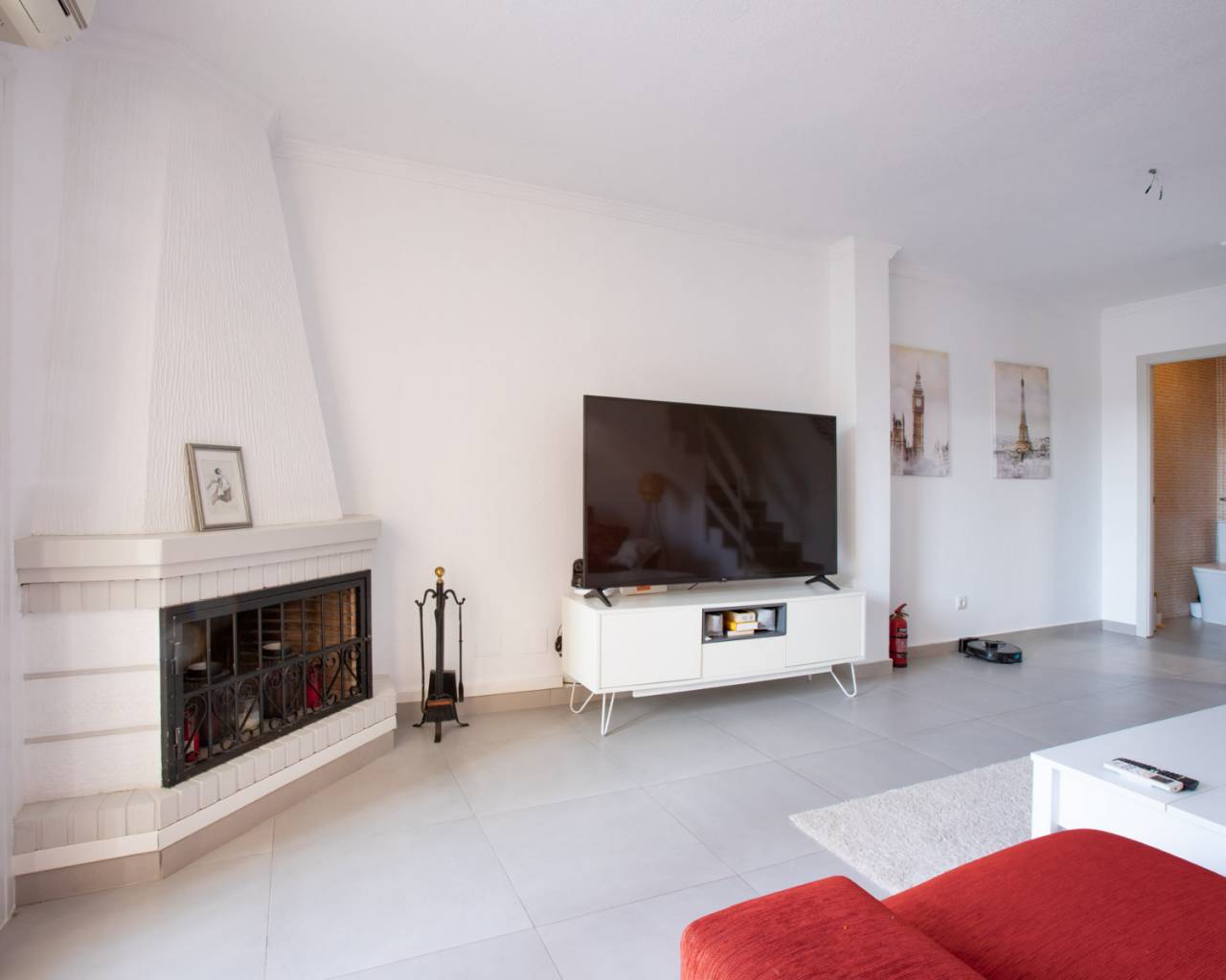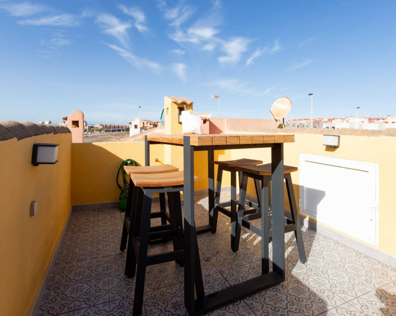 This stylish, fully renovated townhouse embodies modern design and high-quality materials across its two floors, with the addition of a private rooftop solarium—a perfect spot for relaxing and enjoying sunny days. The inviting living room on the ground floor features a cozy fireplace, creating a warm atmosphere for those cooling evenings and relaxed moments. Also on this level are a separate WC and a newly renovated, modern gray kitchen with integrated appliances. The light gray large-tiled floors enhance the sense of spaciousness and are easy to maintain. The open dining and workspace area blends seamlessly with the kitchen and living room, supporting a modern and open lifestyle. Upstairs, the Scandinavian-inspired style continues. The bedroom floors are adorned with beautiful oak laminate, adding warmth and a natural touch. The master bedroom opens onto both a private balcony and the solarium, and both bedrooms feature full-wall wardrobes offering ample, discreet storage space. The upstairs bathroom presents a serene look with light tones, complemented by trendy black accents that add a stylish contrast. For year-round comfort, the home is equipped with three air heat pumps—one in the living room and one in each bedroom. Situated in the Frutales area, this home provides convenient access to essential services and beautiful natural spots: the beach is only about 600 meters away, the Consum supermarket about 800 meters, and the Finnish market approximately 600 meters. There are also two beautiful parks nearby—Parque de San Roque, about 300 meters away, and Plaza de Sevilla, about 500 meters away. This home combines elegant renovations, modern comfort, and an excellent location near nature and services—an ideal choice for easy and high-quality living!