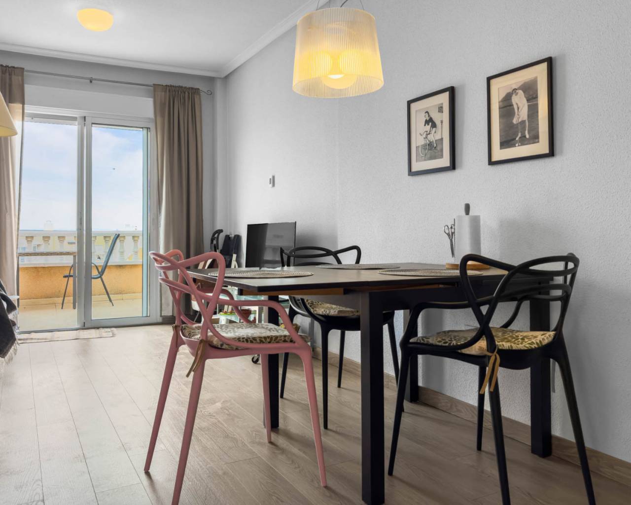 Bright penthouse in the heart of the city – private balcony with evening sun Welcome to the vibrant heart of Torrevieja – this top-floor home offers an easy lifestyle just minutes from the beach and surrounded by services. Space and comfort in a compact package The 51 m² apartment features a spacious living room that flows into the open-plan kitchen. The bedroom has a full-length wardrobe and space for a work area in addition to a double bed. The bathroom is neat and practical, and two air conditioning units keep the indoor climate pleasant year-round. West-facing balcony – your private outdoor haven The wide balcony stretches across the width of the apartment and opens to the west, soaking in the afternoon and evening sun. It’s the perfect spot to relax, sip your coffee or enjoy a peaceful evening breeze. Community amenities for added convenience Residents have access to a community pool, although it's currently under renovation. Perfect location with Mediterranean charm Located in central Torrevieja, everything is within walking distance – shops, restaurants, pharmacies, and the beach is only about 1 km away. Alicante airport is approximately 40 km away.