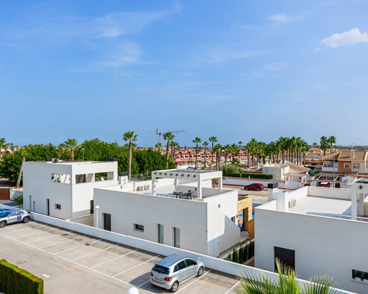 Gorgeous south-facing penthouse with huge roof terrace of 90 m2. The apartment has 3 bedrooms, 2 bathrooms and built-in wardrobes. The penthouse appears as new, and its in a exellent condition. The home was built in September 2019, and is located in a well-established area, and have the most beautiful pool area in Ciudad Quesada. At the entrance to the urbanization there are 4 entrances with locked gates. From there you enter an area with a large communal swimming pool, and beautifully planted green area. At the entrance to the building there is a lift that goes up to the first floor where the apartment is located, AND the lift goes all the way up to the private roof terrace. If you have visitors, guests can take the lift all the way up, without going through the apartment. There are 4 accommodation units that share this lift. At the entrance to the apartment there are wardrobes, then a open kitchen. One of the bedrooms has its own bathroom and there is underfloor heating in both bathrooms. By the living room there is direct access to a south-facing terrace, then there is also an outside private staircase up to the roof terrace. The roof terrace has a pergola, sink with cupboards, storage room and washing machine and dryer. The dryer is directly connected to drainage. There is also a shower here, and plenty of space for both sun loungers and several seating areas. The penthouse is sold with all appliances, lighting, built-in air conditioning and LED lights. The penthouse is sold fully furnished. Walking distance to grocery store, clothing store, pharmacy, go-cart, restaurants, bars, playground and park areas. The center of Quesada is a 15-minute walk away and features countless restaurants, bars, shops, bowling, mini golf and a water park. 8 minutes by car to the beautiful beaches of Guardamar and 35 minutes by car to the airport in Alicante.