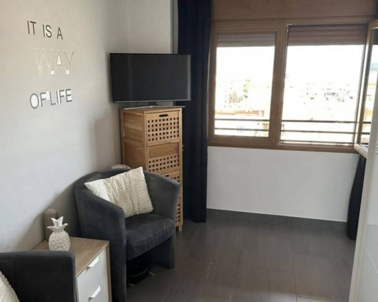 2 bed Flat for sale in Torrevieja - BM-00-1446-AH Frontline penthouse for sale on El Acequion Beach in Torrevieja, just a short walk from the town center. This bright and spacious property features a generous living room with an open kitchen, creating a comfortable and modern living space. The penthouse offers two bedrooms, one bathroom, and a balcony with south and east-facing views, allowing for plenty of natural light and sea breezes. It is equipped with air conditioning and underfloor heating, as well as individual electric heating. Built in 1981, the apartment is located on the 9th floor of an exterior-facing building with an elevator. The property is in good condition and includes built-in wardrobes, a storage room, and access to a communal pool—ideal for enjoying the coastal lifestyle year-round. 118 m² built 2 bedrooms 1 bathroom Balcony Second hand/good condition Built-in wardrobes Storage room South, east facing Built in 1981 Individual heating: Electric 9th floor exterior With elevator Air-conditioning Pool