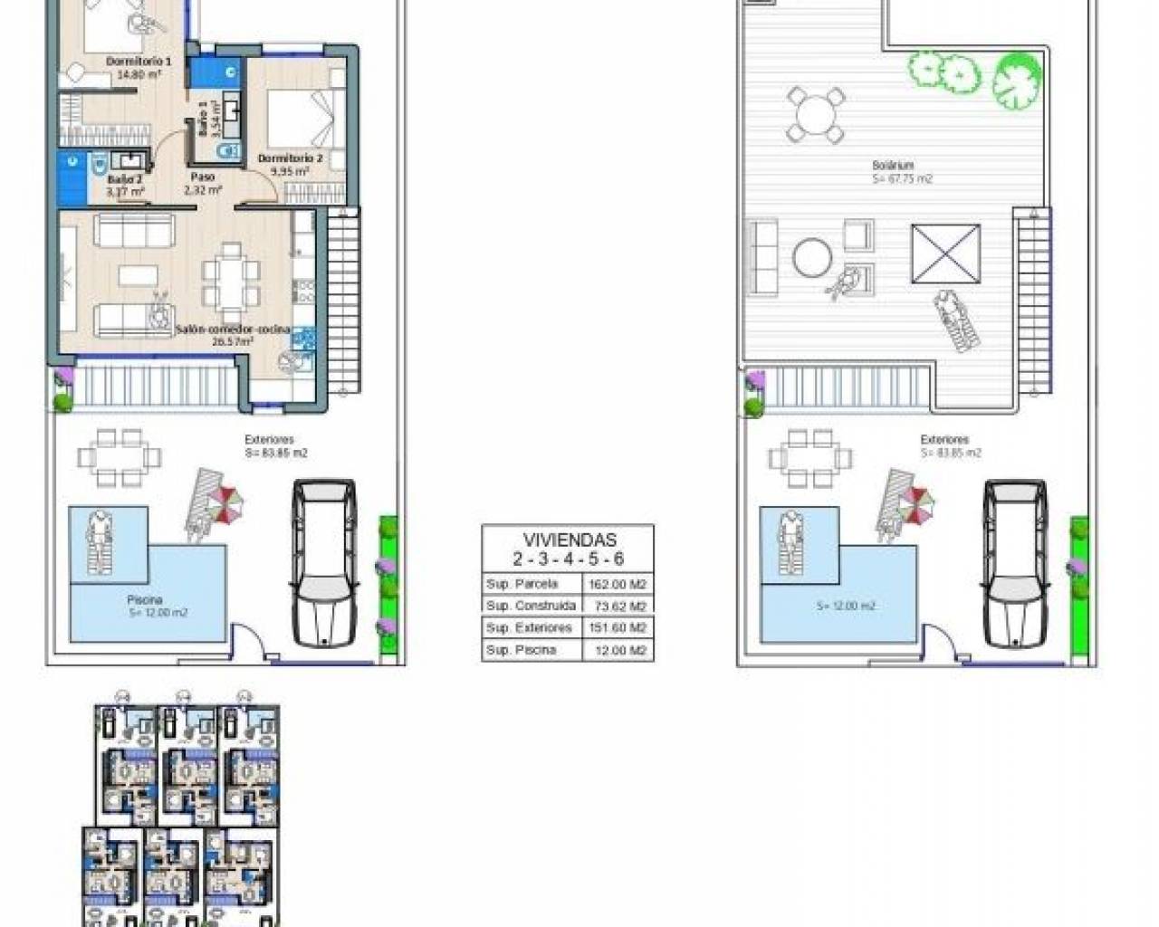 Modern New Build Villas in Torre-Pacheco, Murcia Discover the perfect blend of modern design, comfort, and location with these stunning new build villas in Torre-Pacheco, Murcia. Whether you’re seeking a permanent residence, holiday home, or investment property, these stylish detached villas offer exceptional value and convenience in one of Spain’s most sought-after regions. Stylish Villas with Premium Features These modern single-level villas feature 2 or 3 bedrooms and 2 bathrooms, designed with an open-plan kitchen and a spacious living/dining area. Each home is equipped with: Private Pool: Complete with an outdoor shower, filtration system, and LED lighting. Solarium with Summer Kitchen: Includes a sink and pre-installation for a washing machine and mini fridge, accessible via an exterior staircase. High-Quality Appliances: Balay brand ceramic hob, oven, column microwave, refrigerator, extractor hood, and integrated dishwasher. Additional highlights include premium porcelain sanitary ware in bathrooms, fully equipped wardrobes with white lacquered doors, and energy-efficient interior and exterior LED lighting. Prime Location with Excellent Connectivity Situated in the charming village of Torre-Pacheco, these villas are surrounded by essential amenities like supermarkets, banks, bars, and restaurants. The location offers an ideal balance of tranquility and accessibility: Beaches of Mar Menor: Just a 15-minute drive (approx. 12 km). Murcia International Airport: Only 20 minutes away (approx. 18 km). Golf Courses: Torre-Pacheco is renowned for its award-winning golf courses, several of which are just a short drive from the villas. Shopping & Entertainment: Cartagena Port and its vibrant shopping scene are within 30 minutes (approx. 26 km), while the city of Murcia, known for its culture and dining, is around 35 minutes away (approx. 37 km). Elegant Living in a Healthy Environment Torre-Pacheco and the surrounding Murcia region are celebrated for their exceptional quality of life, offering a healthy Mediterranean climate and abundant outdoor activities. The villas modern interiors and premium finishes make them both stylish and functional, creating a welcoming space for relaxation and entertaining. Make Your Move Today These new build villas in Torre-Pacheco combine luxury, convenience, and value in an unbeatable location. Don’t miss the opportunity to own a property in one of Spain’s healthiest and most desirable areas. Contact us now to schedule a viewing or request more information!