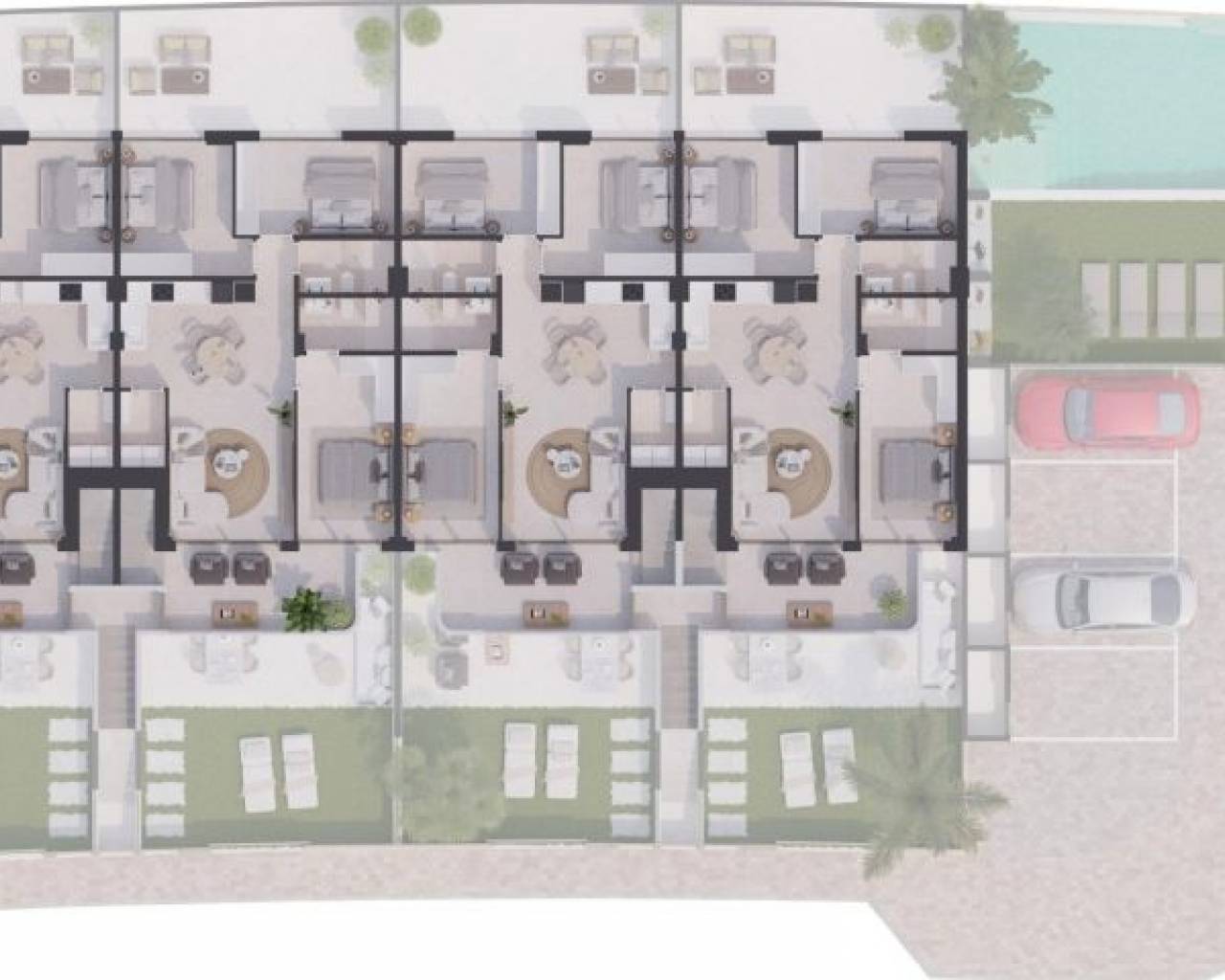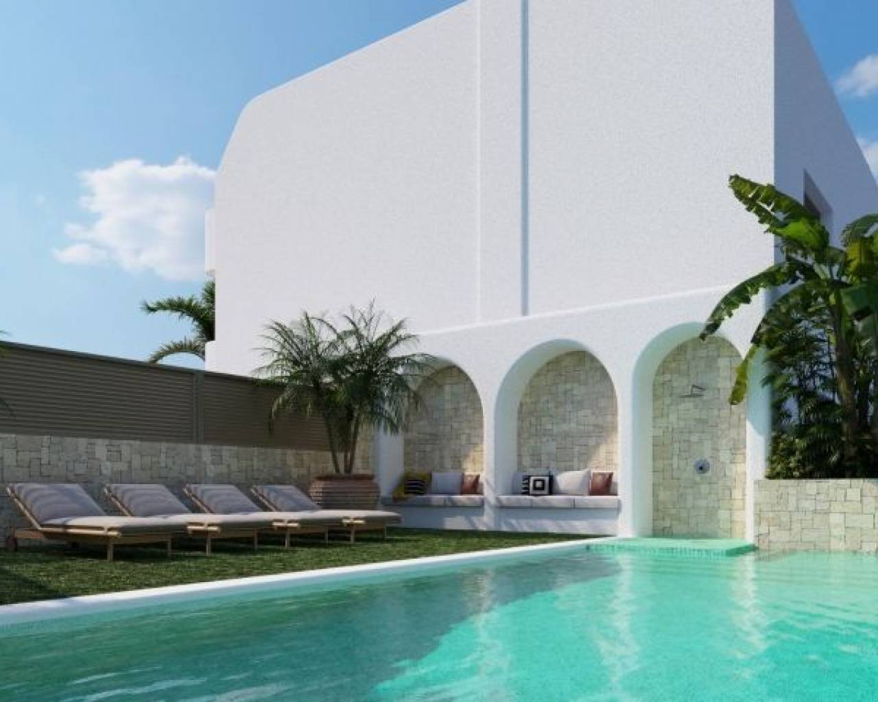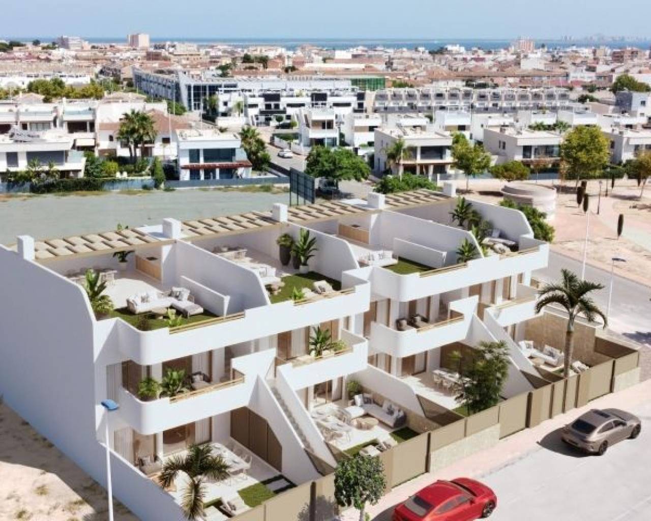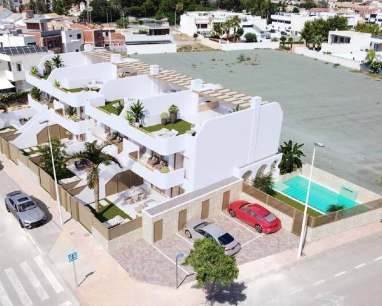 New Build Bungalows in San Pedro del Pinatar – Modern Living by the Sea Exclusive Residential Complex with Modern Bungalows Discover this new residential complex of 8 modern bungalows in San Pedro del Pinatar, one of the most desirable locations on the Costa Cálida. These contemporary homes offer 3 bedrooms, 2 bathrooms, an open-plan kitchen with a spacious living area, built-in wardrobes, and a private terrace. You can choose between: Ground floor bungalows with a private garden and on-plot parking. Top floor bungalows with a private solarium, perfect for enjoying the Mediterranean climate. High-Quality Features in Every Home Each bungalow includes top-tier finishes and modern features for maximum comfort: Air conditioning unit included. Aerothermal system for energy-efficient hot water production. Fully fitted kitchen with BOSCH appliances. Fully equipped bathrooms with furniture, mirrors, shower screens, and electric underfloor heating. Electric shutters on all windows. LED lighting throughout the interior and exterior of the property. Additional features for top-floor bungalows: Aluminum pergola for shade and style. Outdoor summer kitchen, perfect for entertaining. Private parking space and storage room for bicycles. Community Amenities Residents of this exclusive complex will enjoy: A beautifully landscaped communal area. A community swimming pool to relax and refresh. Prime Location in San Pedro del Pinatar San Pedro del Pinatar is a privileged coastal town, located between the Mar Menor and the Mediterranean Sea. It is well known for its beaches, natural mud baths, and excellent nautical facilities, including marinas and yacht clubs. The area is a paradise for water sports enthusiasts and offers a relaxed Mediterranean lifestyle with all essential services nearby. San Pedro del Pinatar boasts an established year-round community, with access to sports facilities, an indoor swimming pool, and a vibrant social scene, thanks to the region’s mild winter climate. The famous Lo Pagán area has grown significantly, offering a full range of amenities, shops, restaurants, and entertainment options. Distances to Key Points of Interest Dos Mares Shopping Center – 5 minutes. Mar Menor Beaches – 10 minutes. Murcia-Corvera Airport – 30 minutes. Alicante Airport – 1 hour. Invest in Quality & Lifestyle These modern bungalows offer an exceptional opportunity to own a home in one of the most sought-after areas of the Costa Cálida. Whether as a holiday retreat, investment, or permanent residence, this is your chance to embrace the Mediterranean lifestyle. Contact us today to schedule a visit and secure your dream home in San Pedro del Pinatar!
