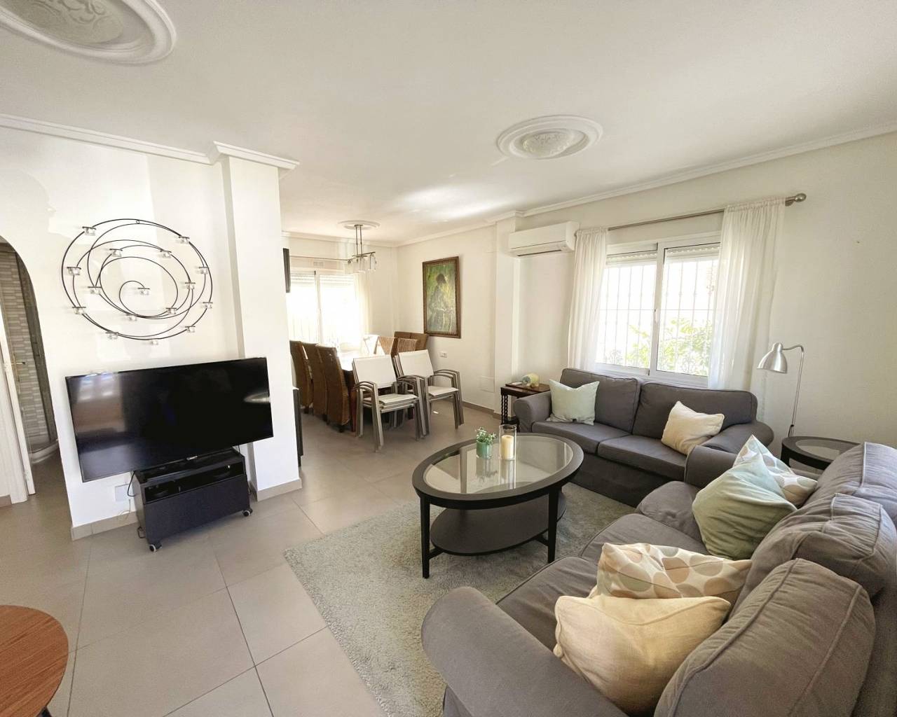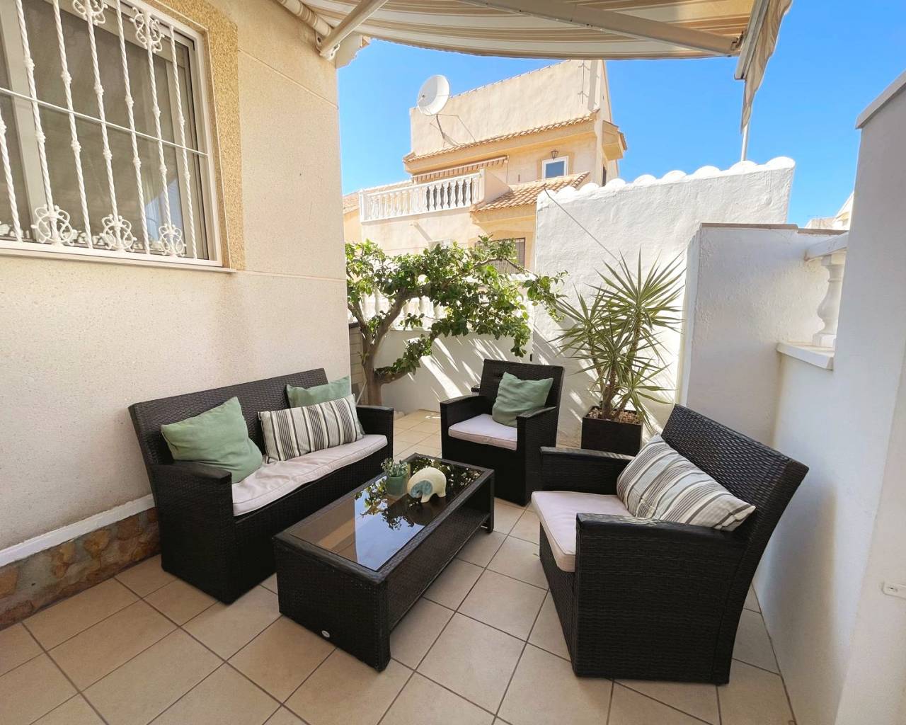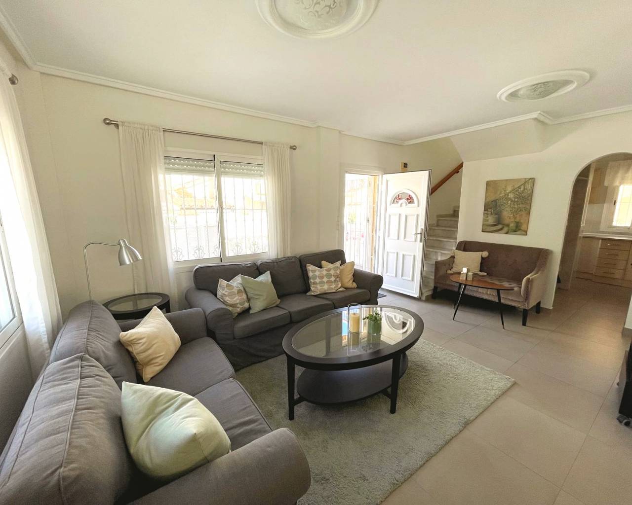 A popular Jazmine style villa is presented for sale in excellent condition and has been maintained to a very high standard. This property offers a spacious 2 bedroom 2 bathroom accommodation, having been redesigned into a 2 bed version with an enlarged lounge and separate dining area. On the ground floor is the large lounge / diner with triple aspect windows allowing natural light to flood into this property. A complete refitted “L” kitchen also enlarged allowing extra space and fitted out to perfection. A staircase leads up to the first floor landing with access to the master bedroom and ensuite. There is a glazed door form this landing that opens onto a private roof terrace. Patio doors also from the master bedroom open onto this same terrace. Outside, this property offers excellent out door relaxing and entertaining space which has been enhanced with full awnings and seating areas. The property has exception storage areas Viewing is highly recommended as this property has a lot more to offer