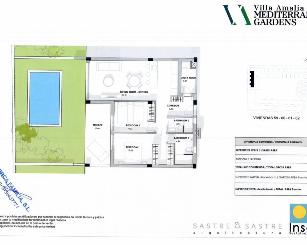 Ground Floor Apartment with Garden in Villa Amalia Eco ResidentialBeautiful ground floor apartment in Villa Amalia Eco Residential, located just 100 meters from the Playa de los Náufragos and Cala Ferris. The property has 112.08m² built and 68.29m² usable, distributed in living-dining room with open plan kitchen, utility room, 2 bedrooms, and 2 bathrooms, including master bedroom with walk-in closet and en-suite bathroom. It also features a private garden of 57.42 m² and a terrace of 12.66m², perfect for enjoying the Mediterranean climate, as well as a subterranean parking space. The property is sold unfurnished. The residential complex offers extensive landscaped areas, 3 communal swimming pools, heated pool, children's pool, gym, chill-out area, picnic area, elevator, and shared underground parking. An excellent opportunity close to the sea, surrounded by amenities and 40 minutes from the airports of Alicante and Murcia.