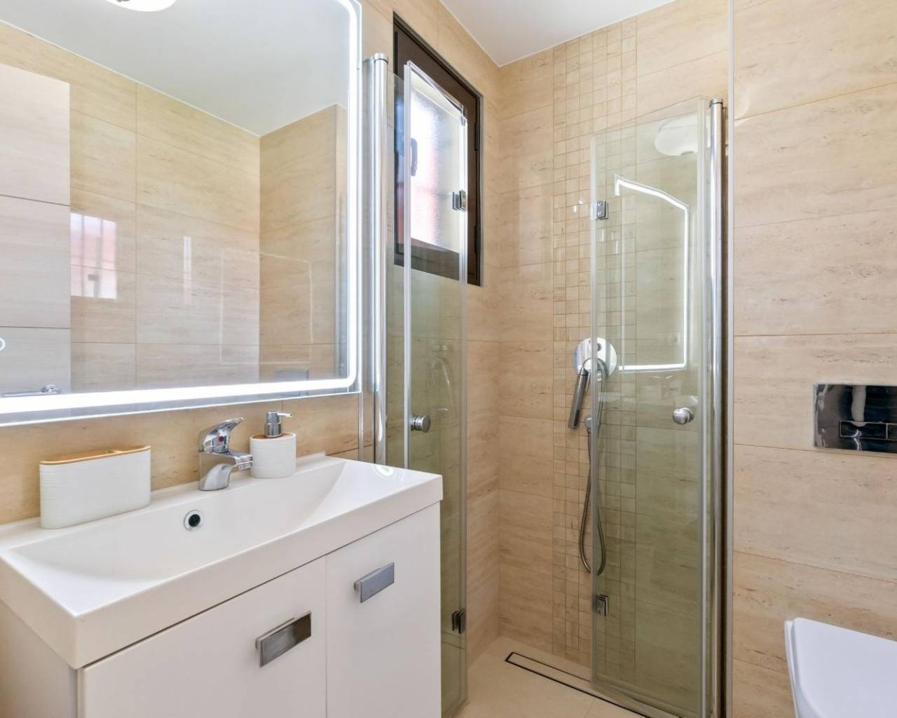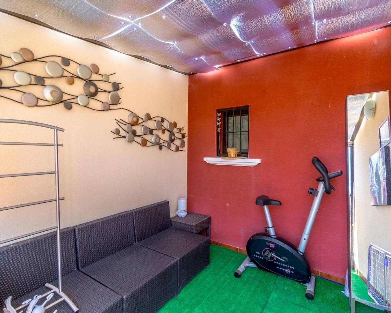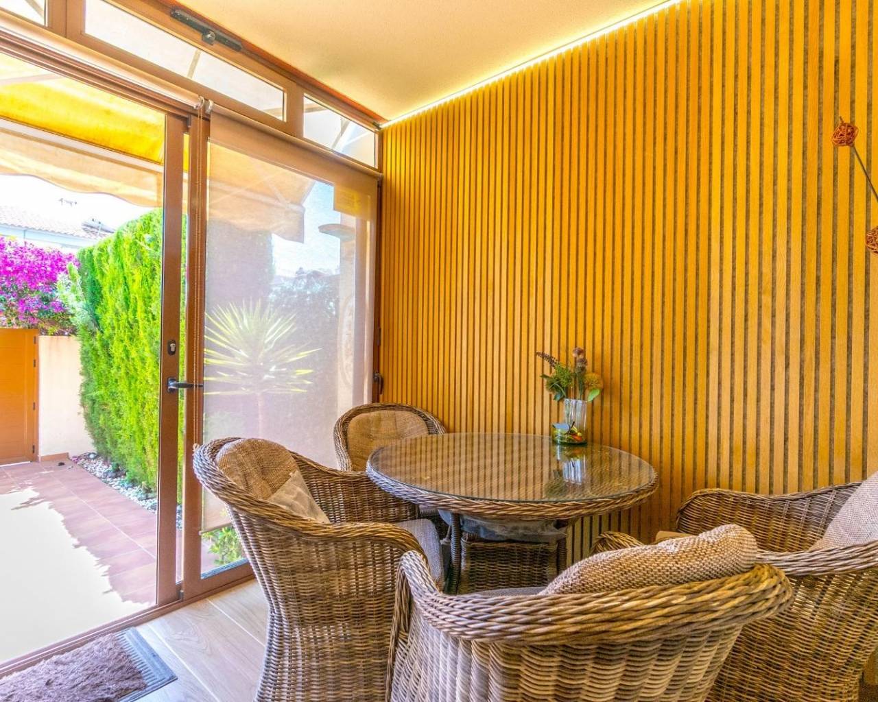 This stunning two-storey townhouse combines privacy, comfort, and contemporary design in a fully renovated home decorated with exceptional taste. It features three spacious bedrooms with fitted wardrobes and two modern bathrooms, offering a functional and elegant living space. The fully equipped kitchen connects seamlessly to a bright and stylish living room furnished with high-quality pieces, including two leather sofas. Enjoy exceptional outdoor areas: a 43 m² front terrace with rattan garden furniture, a private rear patio, an upper-floor balcony, and a 40 m² private solarium — ideal for relaxing and enjoying the Mediterranean climate all year round. The property is sold fully furnished and equipped, including three TVs (50”–65”), Bosch dishwasher, Ariston Wi-Fi water heater, Panasonic air conditioning, infrared heating in every room. It also includes an alarm system, surveillance cameras, reinforced anti-theft doors and windows (up to 120 kg), safety bars, Grohe taps, and garden lighting with automatic irrigation and awnings. Every detail has been meticulously renovated: floors, bathrooms, bedrooms, and outdoor areas. Sold exactly as shown in the photos, ready to move in. A unique home for those seeking quality, elegance, and peace in a prime location.