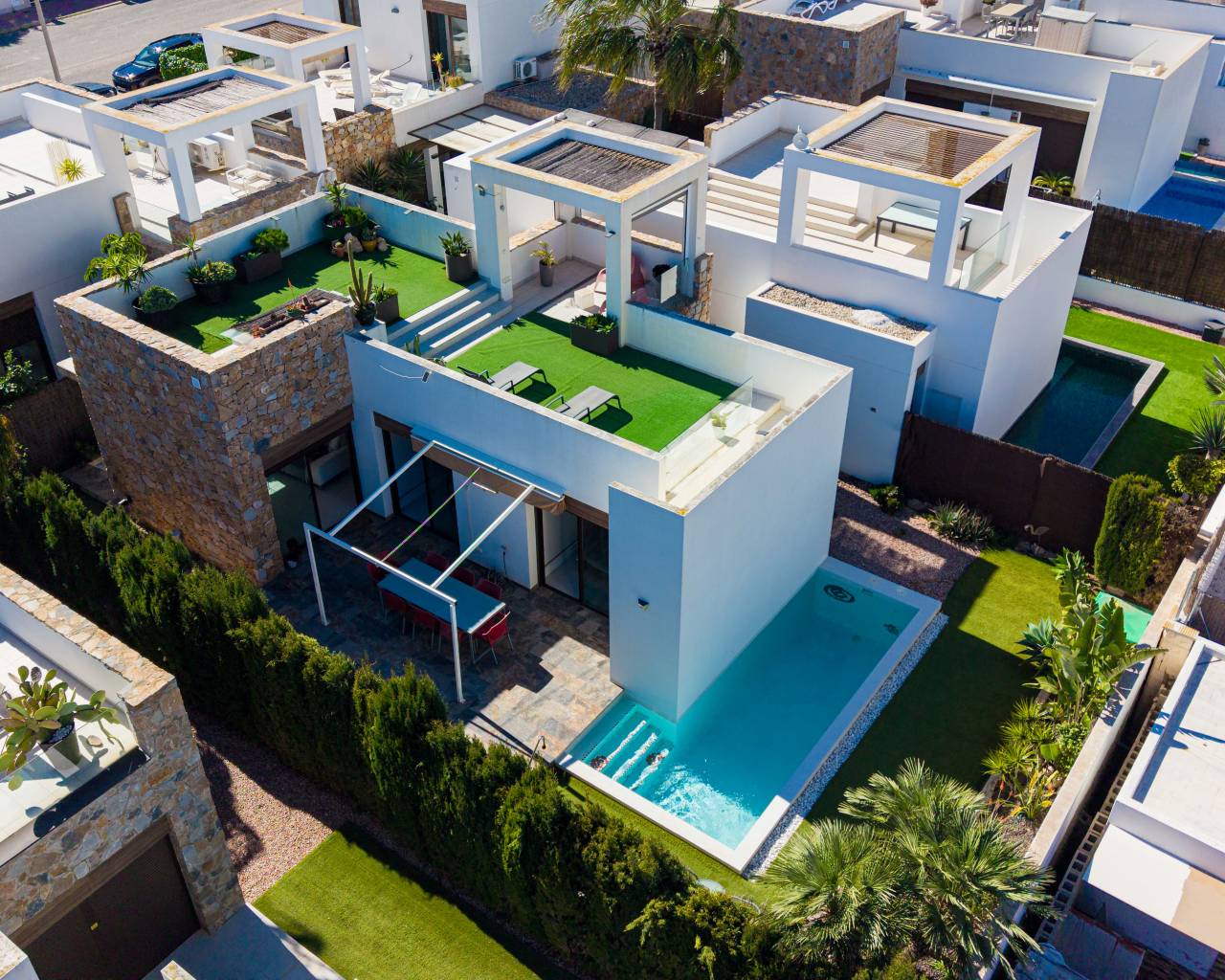 Located in the established residential area of Lomas de Cabo Roig, this nearly new semi-detached villa with private swimming pool represents a highly attractive opportunity for European buyers seeking a secure real estate investment on the Southern Costa Blanca. Built in 2015 and maintained in very good condition, the property combines contemporary design, functional distribution, and strong rental appeal within one of the most consolidated international communities in Orihuela Costa. Property Specifications and Layout Set on a generous private plot of 259 m², this villa offers privacy, outdoor living space, and excellent usability for both holiday and long-term stays. The exterior area includes: Landscaped gardenDedicated chill-out zonePrivate swimming pool of approximately 17 m²Outdoor parking space included in the priceNorth-East orientation, ensuring balanced natural light throughout the day The interior provides approximately 93 m² of constructed area (around 91 m² usable), distributed across: 2 spacious bedrooms with fitted wardrobes2 modern bathroomsBright living-dining area with abundant natural lightGlazed porch extension, enhancing year-round usability and interior comfort The layout has been designed for practical Mediterranean living, offering efficient use of space, natural ventilation, and strong cross-light exposure. Air conditioning and individual heating systems further increase the property’s appeal for winter rentals and permanent residency, expanding the occupancy potential beyond the peak summer season. Private Solarium with Open Views One of the standout features of this villa is the impressive 70 m² private rooftop solarium. This elevated outdoor space offers open panoramic views and exceptional privacy — a highly desirable feature in the Costa Blanca property market. The solarium significantly increases the usable living area and provides an ideal setting for sunbathing, outdoor dining, or private gatherings. For investors, this type of additional outdoor space is a strong differentiator in the short-term rental segment. Strategic Location and Accessibility Lomas de Cabo Roig has become a preferred destination for buyers from the UK, Scandinavia, Belgium, the Netherlands, Germany, and other European markets. The area benefits from a stable year-round population, well-developed infrastructure, and strong resale liquidity. Within walking distance, residents have access to: International supermarketsRestaurants and cafésBars and leisure facilitiesEssential services The renowned beaches of Cabo Roig and Campoamor are located approximately 3–3.5 km from the property, offering Blue Flag standards, marinas, and coastal promenades. The wider coastline of Torrevieja further enhances the leisure and lifestyle offering of the area. The popular Zenia Boulevard shopping centre is also just a short drive away, reinforcing the property’s convenience and rental attractiveness. Investment Perspective From an investment standpoint, this semi-detached villa offers: Modern construction (2015) with low structural riskStrong demand for detached and semi-detached villas with private poolsHigh appeal in the holiday rental marketCompetitive price compared to frontline beach propertiesEstablished international micro-market with stable capital appreciation Independent and semi-detached villas with private pools in Lomas de Cabo Roig remain limited in supply compared to apartments, supporting long-term value retention. Whether positioned as a second residence, a buy-to-let holiday property, or a hybrid personal-use investment, this villa offers a balanced combination of privacy, location, and rental performance potential in one of the most resilient residential zones of the Costa Blanca.