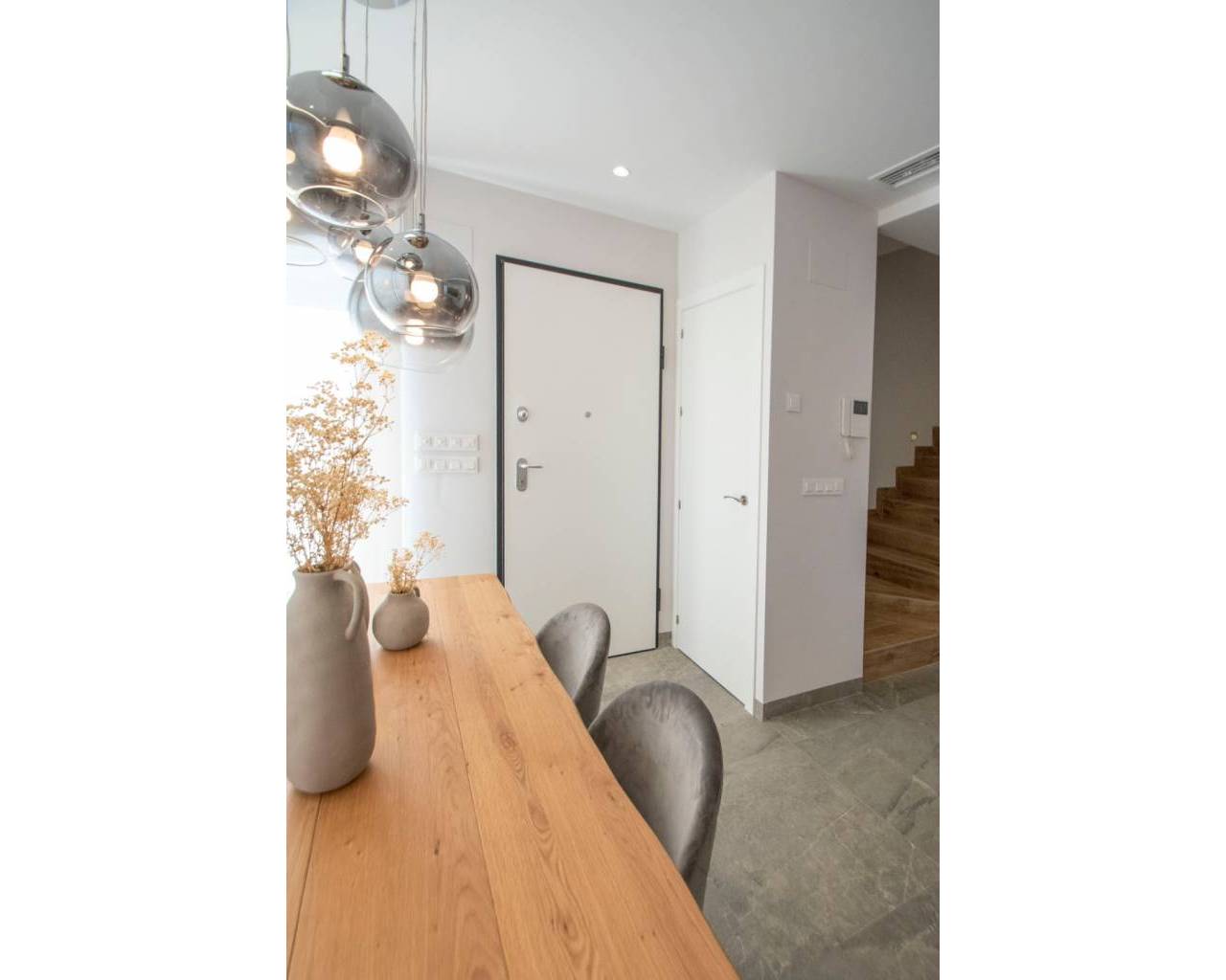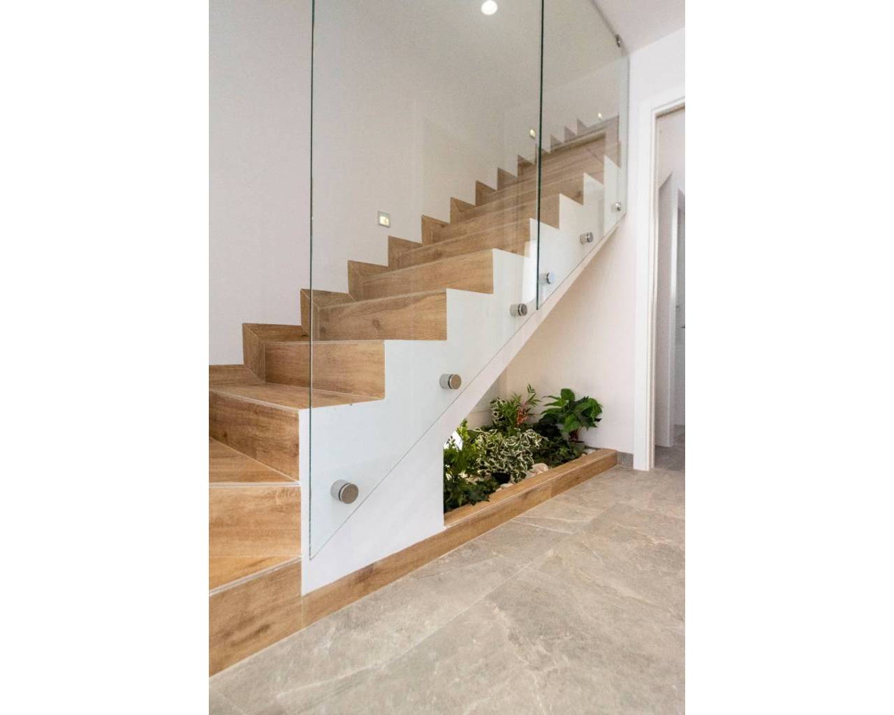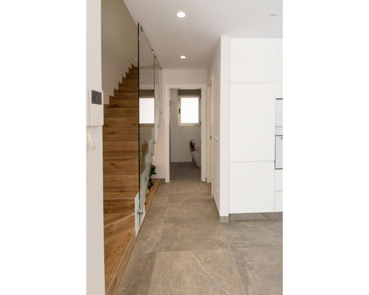 Fantastic Villa for sale located in Lo Romero Golf, Pilar de la Horadada. In the centre of the Lo Romero Golf Club is this private residential complex , with a communal pool and views of the golf course and its idyllic surroundings. 7km from the seaport and the best beaches of Torre de la Horadada such as the Jesuit beach, known for its large size, its clean waters and white sand, in addition to the fact that it is very common to practice sports such as volleyball, handball, surfing, etc. You will also find beautiful coves where you can dive and get to know the marine fauna first-hand. Two-storey villa of 127.44m² that is distributed in a spacious living room attached to an American kitchen with breakfast bar on the peninsula, it also consists of two large terraces and a swimming pool. Three double bedrooms two of them en suite with en-suite bathroom and a separate bathroom. The house has been designed and built with the best qualities on the market and a contemporary style, quite bright, with windows in all orientations. On the third floor there is a solarium of 54.00m² where you can enjoy the views and the sunny days offered by the Mediterranean.