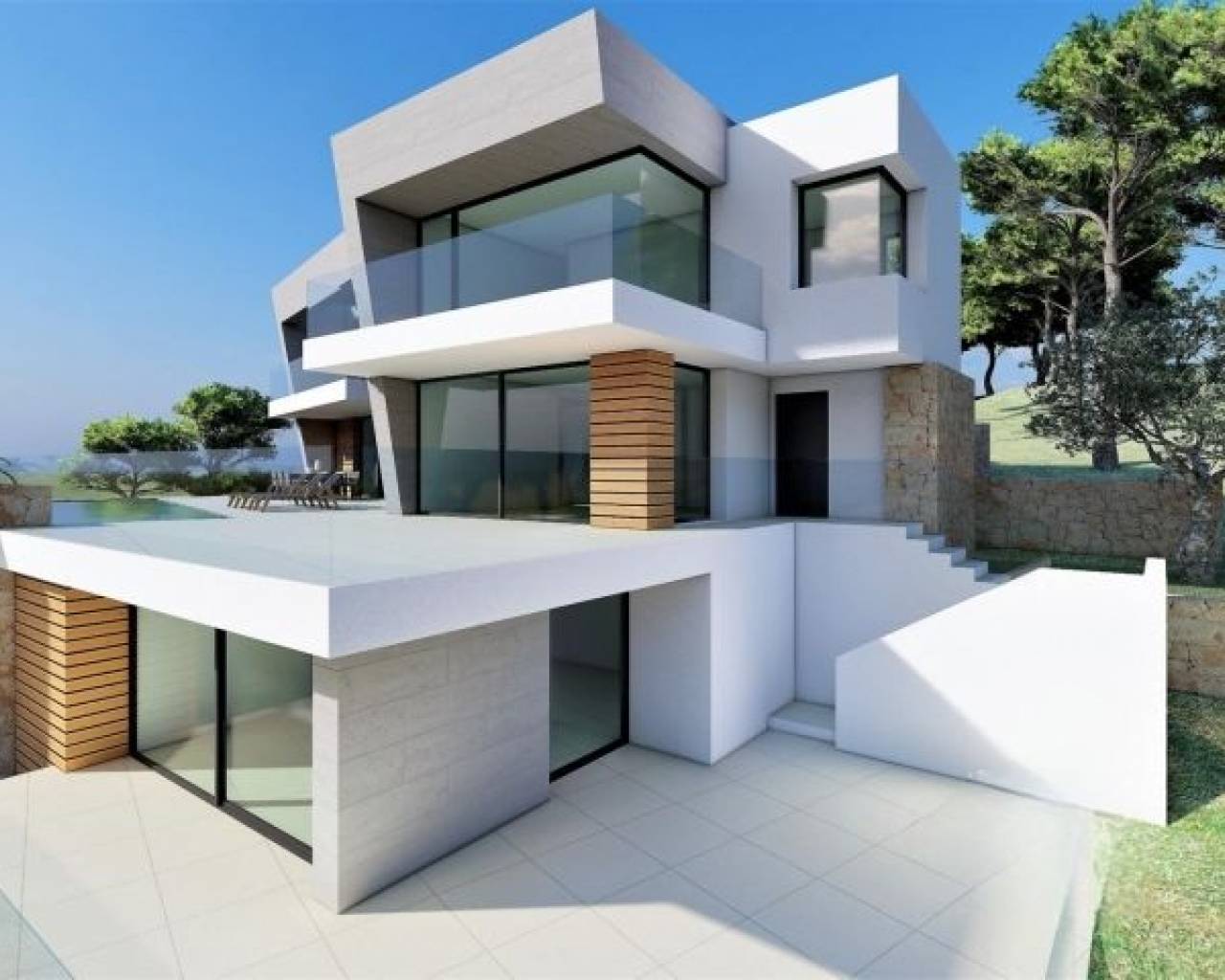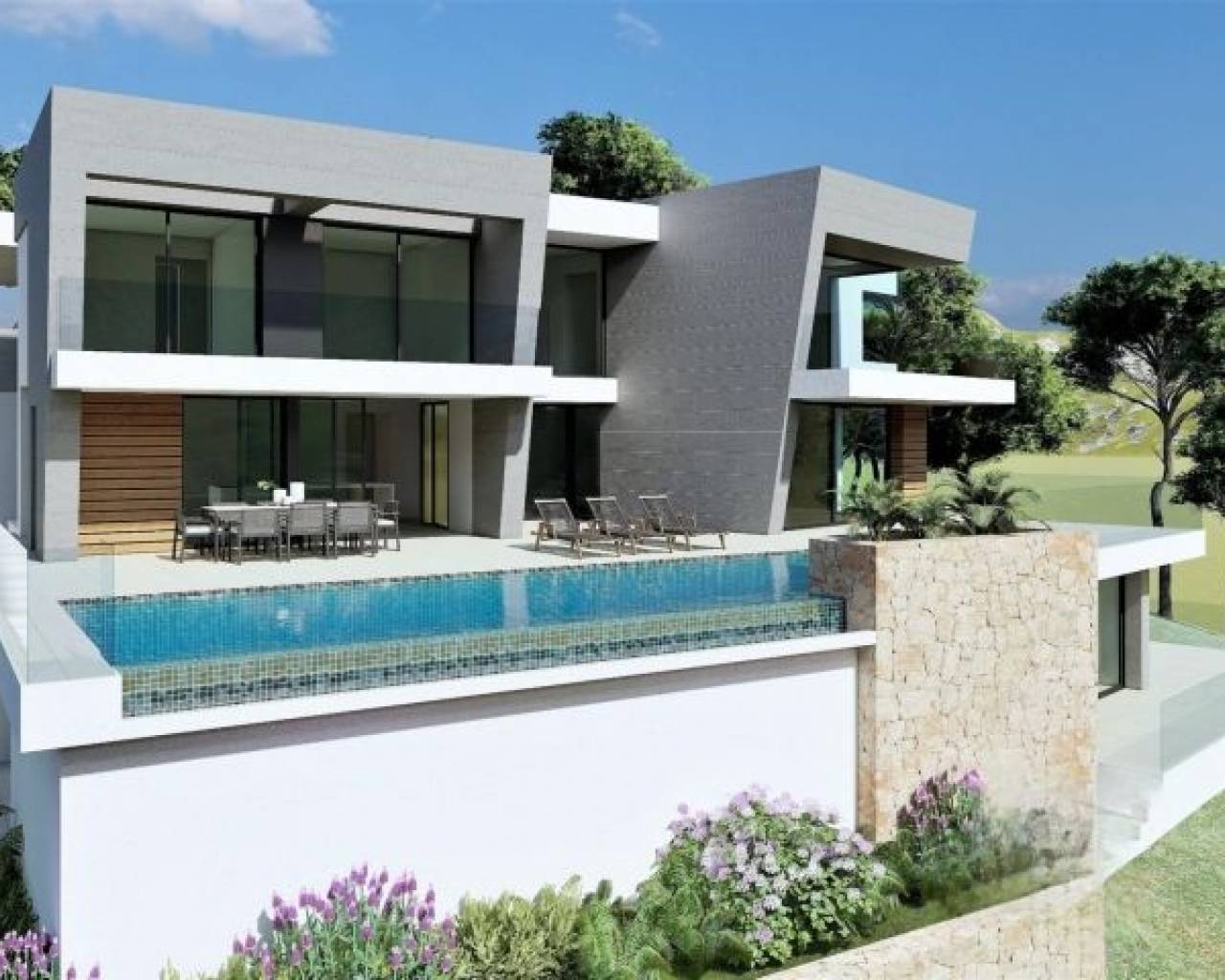 НОВАЯ ВИЛЛА КЛАССА ЛЮКС В КУМБРЕ-ДЕЛЬ-СОЛЬ В самом сердце жилого комплекса Кумбре дель Соль находится эта роскошная вилла с частным бассейном. Современный дизайн виллы новой постройки сочетает в себе элегантный и функциональный подход, современную и средиземноморскую архитектуру. На фасаде, характеризующемся большими геометрическими формами, основанными на диагональных линиях, преобладает белый цвет, а использование натурального камня позволяет ему слиться с окружающей средой. Огромный сад в средиземноморском стиле, увенчанный бассейном с эффектом бесконечности, который сливается с синевой моря, а также мягкий климат северной части Коста-Бланки приглашают вас наслаждаться долгими днями на свежем воздухе почти круглый год. Его расположение позволит вам насладиться спокойной и комфортной обстановкой. Вилла расположена на 3 этажах. На верхнем этаже находится крытая парковка на два автомобиля и лифт, который соединяет весь дом. На этом этаже находится "ночная зона", состоящая из двух спален, сьюта с ванной комнатой, гардеробной и собственной террасой, а также общей ванной комнаты. Все спальни имеют выход на террасу, откуда открывается один из лучших видов на море на побережье Коста-Бланка. Просыпаться, наблюдая за восходом солнца на горизонте Средиземного моря, - одна из многих роскошных возможностей, которые может предложить вам эта вилла. На нижнем этаже мы можем найти гостиную, где широкие открытые пространства и естественное освещение являются главными достопримечательностями, и где граница между внутренним и внешним сливается воедино благодаря большим стеклянным стенам, которые позволяют получить доступ к саду и бассейну. Кухня, оснащенная современной электротехникой ведущих брендов, имеет центральный остров, а также просторную зону скамеек, которая предоставляет вам много места для хранения. На открытой площадке есть крытая зона, где вы сможете проводить лучшие светские мероприятия, будучи защищенными от солнца. Цокольный этаж виллы позволяет превратить ее в 4-спальную, или же персонализировать это пространство по своему усмотрению (спортзал, офис, игровая комната...). На вилле есть полы с подогревом, а также система кондиционирования воздуха, система домашней автоматизации, ЭКОДАН... В жилом комплексе есть собственный супермаркет, бары и рестораны, спортивные площадки и даже оптоволоконная связь, что делает Кумбре дель Соль идеальным местом для работы из дома. Все эти характеристики делают виллу идеальным вариантом для отдыха с друзьями и семьей в течение длительного периода времени или даже в качестве основного места жительства.
