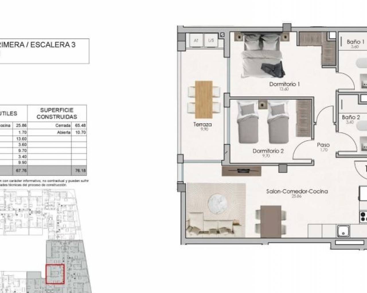 НОВЫЙ ЖИЛОЙ КОМПЛЕКС В САНТА-ПОЛА Новый современный жилой комплекс закрытого типа, состоящий из 1, 2 и 3 спальных квартир и пентхаусов с 2 ванными комнатами. Комплекс состоит из 4 лестничных клеток с просторными благоустроенными коммунальными зонами, включая бассейн, зону отдыха и тренажерный зал. Все объекты были тщательно спроектированы, чтобы предоставить вам исключительные условия для жизни, с высококачественной отделкой и современным стилем. Наслаждайтесь просторными террасами, где вы можете расслабиться, пообедать на свежем воздухе и полюбоваться самыми впечатляющими закатами. Расположение просто непревзойденное: рядом с центром Санта-Полы и пальмовой рощей, а также всего в нескольких минутах от набережной, вы будете находиться рядом с широким выбором ресторанов, баров и супермаркетов. Отличное сообщение с национальной дорогой 332, которая соединяет все южное побережье Коста Бланка, и с аэропортом всего за 15 минут.