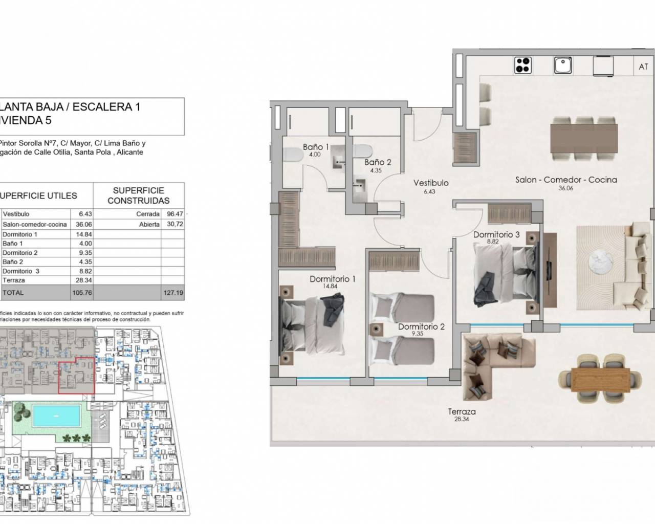 Квартира , расположенная в жилом блоке из 4 этажей, состоит из 127,19 м², распределена в просторной гостиной, присоединенной к большой открытой кухне, полностью оборудованной, трех спален с двуспальными кроватями, одна из них с ванной комнатой, отдельной ванной комнатой и выходом на невероятную террасу площадью 28,34 м² из спален и в свою очередь из столовой.