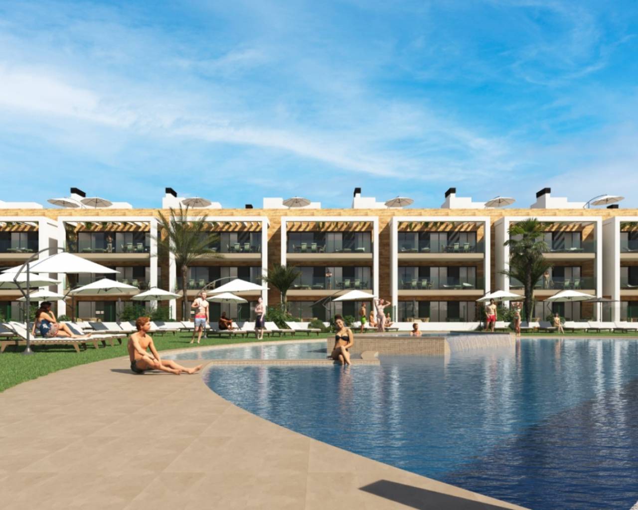 Квартиры на первом этаже площадью 83,50 м² , выходящие на восток, расположены в просторной гостиной, примыкающей к  красивой американской кухне с барной стойкой для завтрака на полуострове, с выходом на большую террасу площадью 18,00 м² с невероятным видом на поле для гольфа . Две спальни с двуспальными кроватями и встроенными шкафами, одна из них спальня с ванной комнатой и отдельной ванной комнатой.
